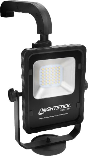A powerful yet lightweight, portable, and rechargeable LED work light. Powerful integrated magnet in the base for easy, secure mounting on a surface. Can be tilted and rotated 360° for optimal positioning. Carry handle at top can also be used as a hanger hook. Floodlight. 1,000 lumens for 4 h, 500 lumens for 8 h. Water/dustproof IP class 67. Drop height 2 m. Toggle switches with seal. Off, low and high intensity settings. Impact-, heat- and chemical-resistant. Serial number for tracing and personal identification. Weight 1.496 kg. Contains lamp, carry handle, rechargeable Li-Ion battery and AC/DC charger.