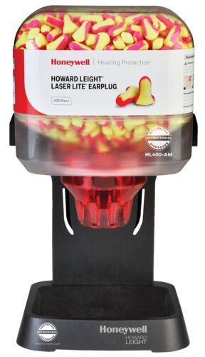 Dispenser HL400-AM med 400 par Laser Lite ørepropper. Øreproppen er i synlig gul- og magenta farge. Den ekspanderer mykt i øregangen som gir en god passform over tid. Dispenseren kan monteres på vegg eller bord. Antimikrobielt beskyttet dispenser.