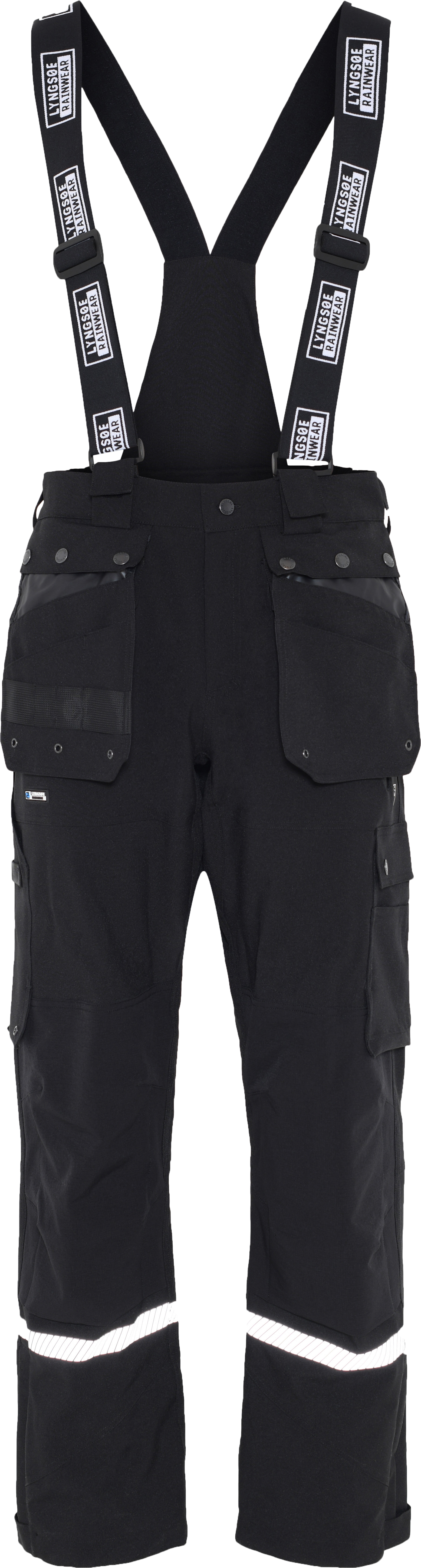 Skallbukse i pustende stretchkvalitet. Avtagbare seler. Elastikk i midjen. Beltehemper. To baklommer med borrelås. Hammer og knivhempe på venstre ben. To lommer foran. To avtagbare spikerlommer. Lommer med trykknapper på legg. Kneputelommer. Glidelås ved anklene. Borrelåsjustering ved anklene. Buksesmekk med glidelås og knapp. Refleks.