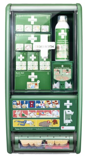 Cederroth førstehjelpsstasjon og kan håndtere flere typer skader, og kan også tilpasses til forskjellige førstehjelpsbehov. Med en komplett førstehjelpsutrustning på din arbeidsplass håper vi at flere skal kunne og våge å hjelpe når en ulykke inntreffer.