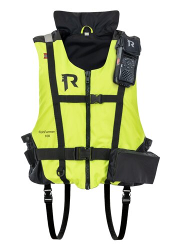 Flytevest Fishfarmer 100N i farge fluoriserende gul og sort PU-belagt slitesterk polyester. Solas® refleks. Kort lengde for god bevegelighet. Høy krage for økt komfort. Glidelåslukning. Knivfeste på begge sider. Belte med plastspenne. Dobbel skrittstropp. Avtagbar VHF-lomme. Avtagbar verktøylomme. Område for egenprofilering på ryggen. 50N oppdrift, reell oppdrift nærmere 100N. Brukervekt 70-90 kg. Kartong: 5 stk.