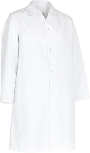 Frakk med knappelukking i front, justering i avslutning av erme og innerlomme med trykknapp. Egner seg til bruk på laboratorier, legekontor og i næringsmiddelindustrien.