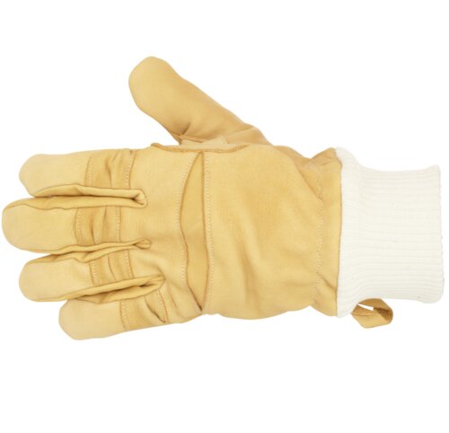 Varmebestandig brannhanske, tåler temperaturer opptil 350° C, sytråden forkulles ved 360° C, vannavstøtende behandlet lær, forkrympet, Kartong: 60.