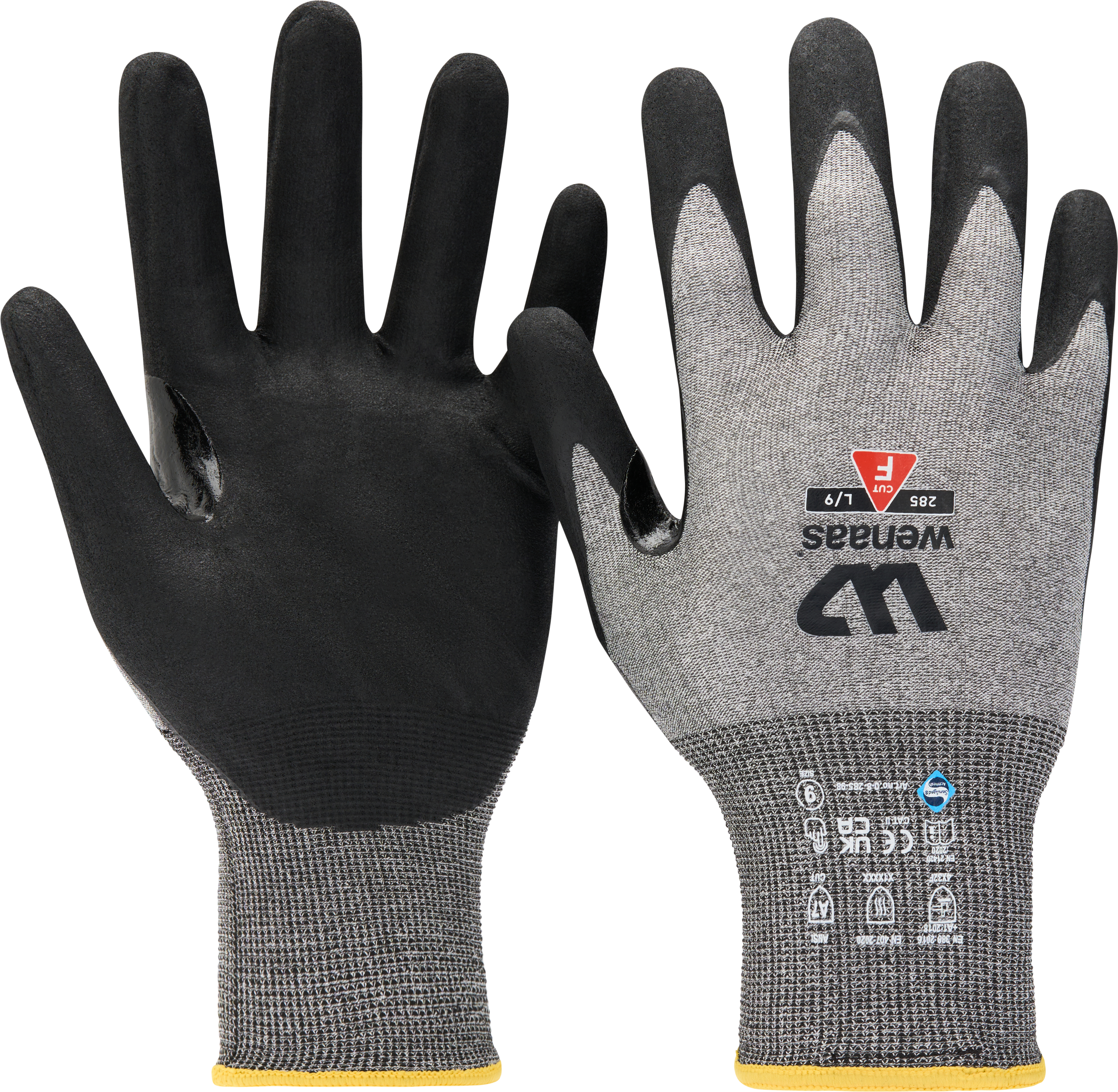 Materiale: Belegg: 28,57 % nitril, garn: 25,35 % wolframtråd, 24,67 % HPPE, 9,87 % nylon, 5,92 % spandex, 3,58 % polyester, 2,03 % gummi