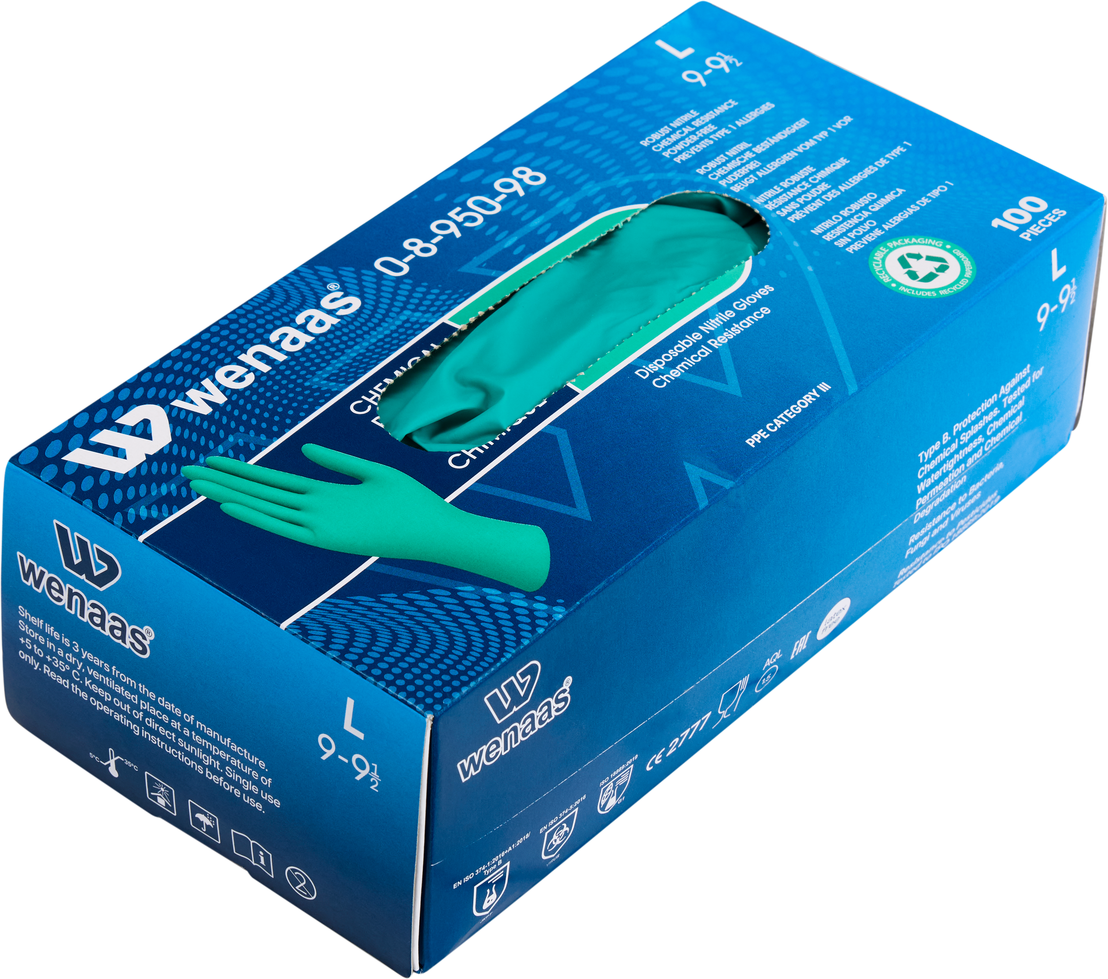 WENAAS 950 er en pudderfri og rivesterk nitrilhanske med høy komfort og sikkert grep. Hansken gir svært god beskyttelse mot kjemikalier og er testet mot et bredt spekter av kjemikalier, noe som gjør den godt egnet for krevende industrielle og profesjonelle miljøer. Mikroteksturerte fingertupper sikrer presis håndtering, også i fuktige og utfordrende arbeidsforhold.