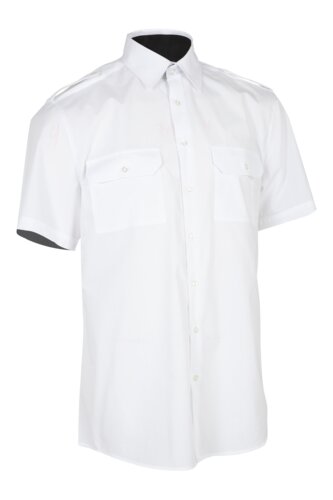 Klassisk kortermet skjorte med spiss krage, skulderklaffer, knappestolpe foran, som lukkes med åtte knapper. Bærestykke bak, innsnitt nederst på ryggen, korte ermer med sydd nedkant. To brystlommer med klaff og knapper, og pennesøm på venstre lomme. Kontrastfarge på innsiden av krage og mansjett.