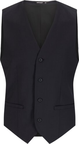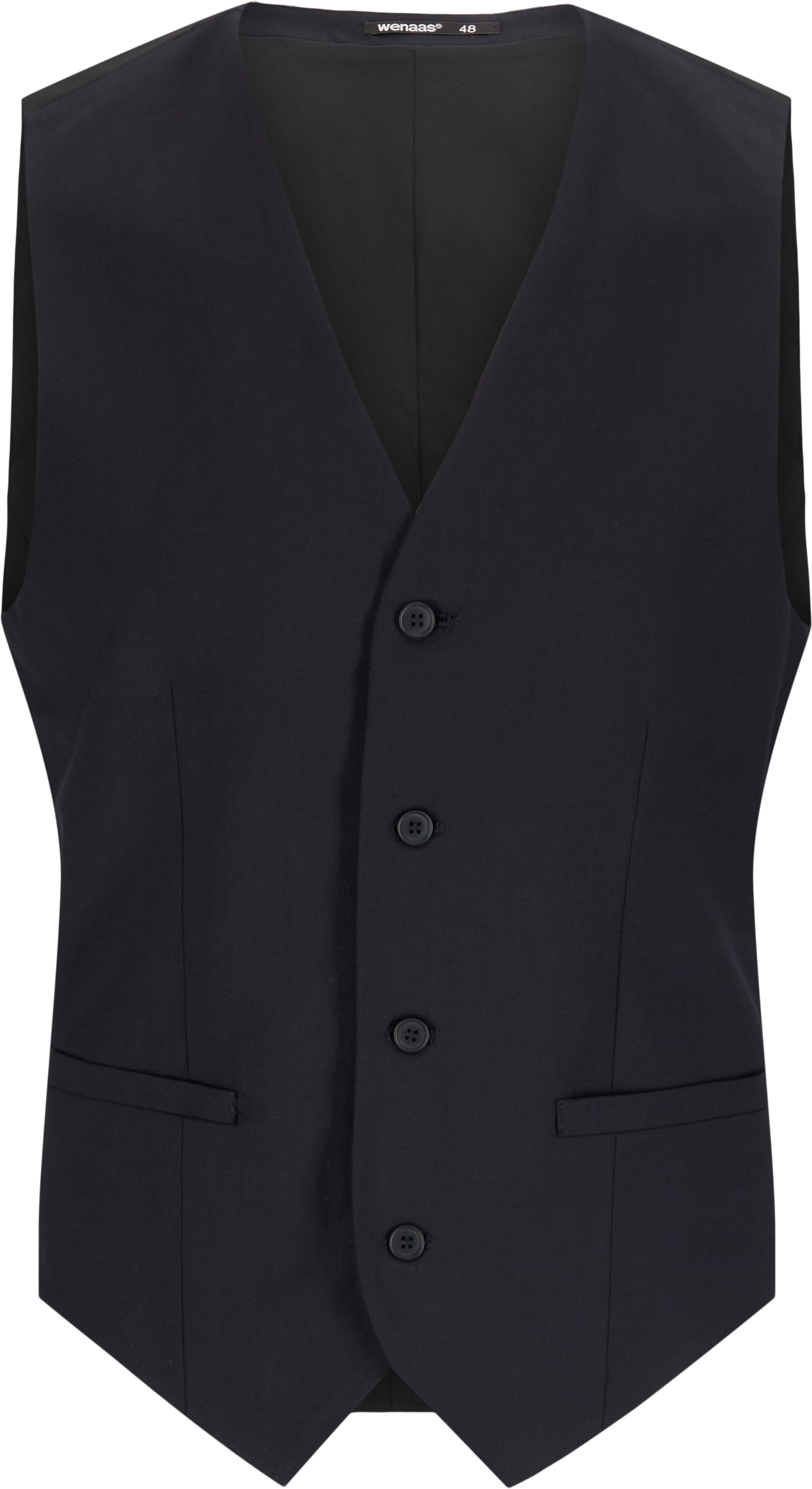 Stilig vest med stretch for herre. Behagelig vest med v-hals, prinsessesømmer foran og bak og to dobbel passepoilerte lommer foran. Belte med strammingsmulighet bak og dobbelt lag med elastisk fôr på midterste bakstykket. Vesten lukkes med fem knapper foran.
