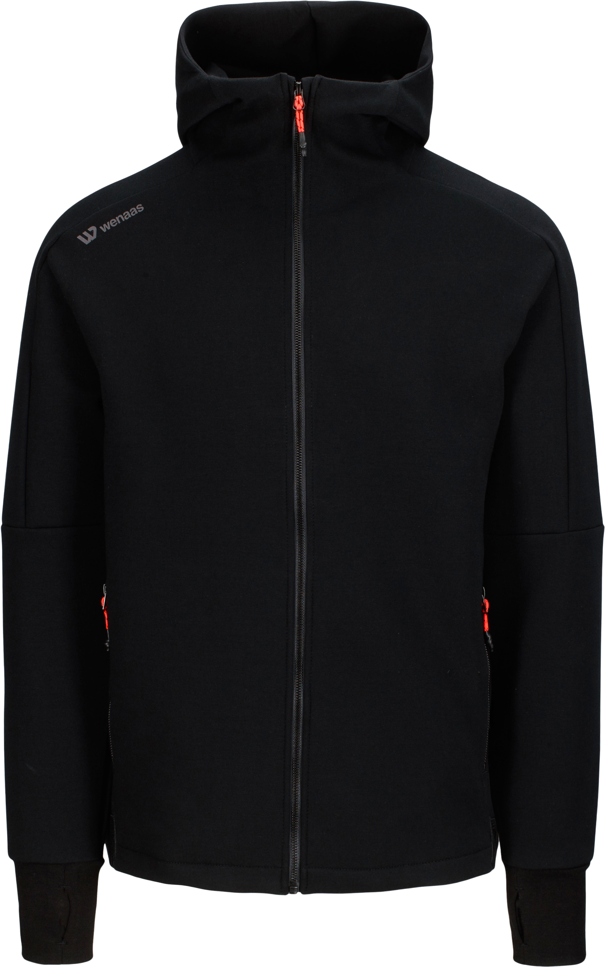 Stretch fleecejakke, stående krage med romslig hette, glidelås i front, lange raglan-ermer, forsterkning på albue og ribb med tommelgrep i ermsåpning. To frontlommer med glidelås og elastisk Wenaas-ribb i nederkant av rygg.
