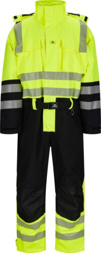Denne vinterkjeledressen er foret med vattert for. Den har en stående krage, en stor avtakbar hette som passer til ulike typer hjelmer, og en toveis glidelås under en dobbel frontklaff. Designet inkluderer bærestykke foran og bak, med en elastisk midje bak, beltehemper, elastisk belte med klikkspenne, sammen med innvendige avtakbare seler. Den har bryst-, for- og baklommer med klaff, tommestokklomme på høyre lår og en stor innvendig nettinglomme. Skjult glidelås med klaff langs utsiden av hvert ben, fra midjen til nedkant av ben. Ermer med innvendige mansjetter, ekstra forsterkninger på utsiden av knærne foran, knepute lommer og snøstopper er på innsiden av bena. Reflekser rundt kroppen, ermene, bena og over skuldrene. Stamming nederst på ermer og ben.