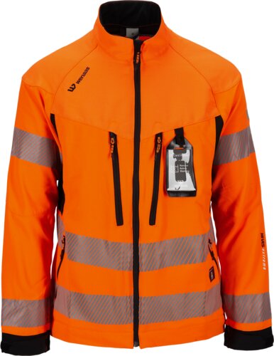 Hivis stretchjakke herremodell med en ergonomisk passform med stående krage, glidelås i front med innvendig klaff, forlenget rygg, to brystlommer med glidelås, avtagbar ID-kortholder, to frontlommer med glidelås, laserhull under arm for ventilering, forsterkning på albuer og nedkant av erme, elastisk mansjett med tommelgrep, viddejustering nede på jakke og erme, refleks i to høyder på ermene og torso.
