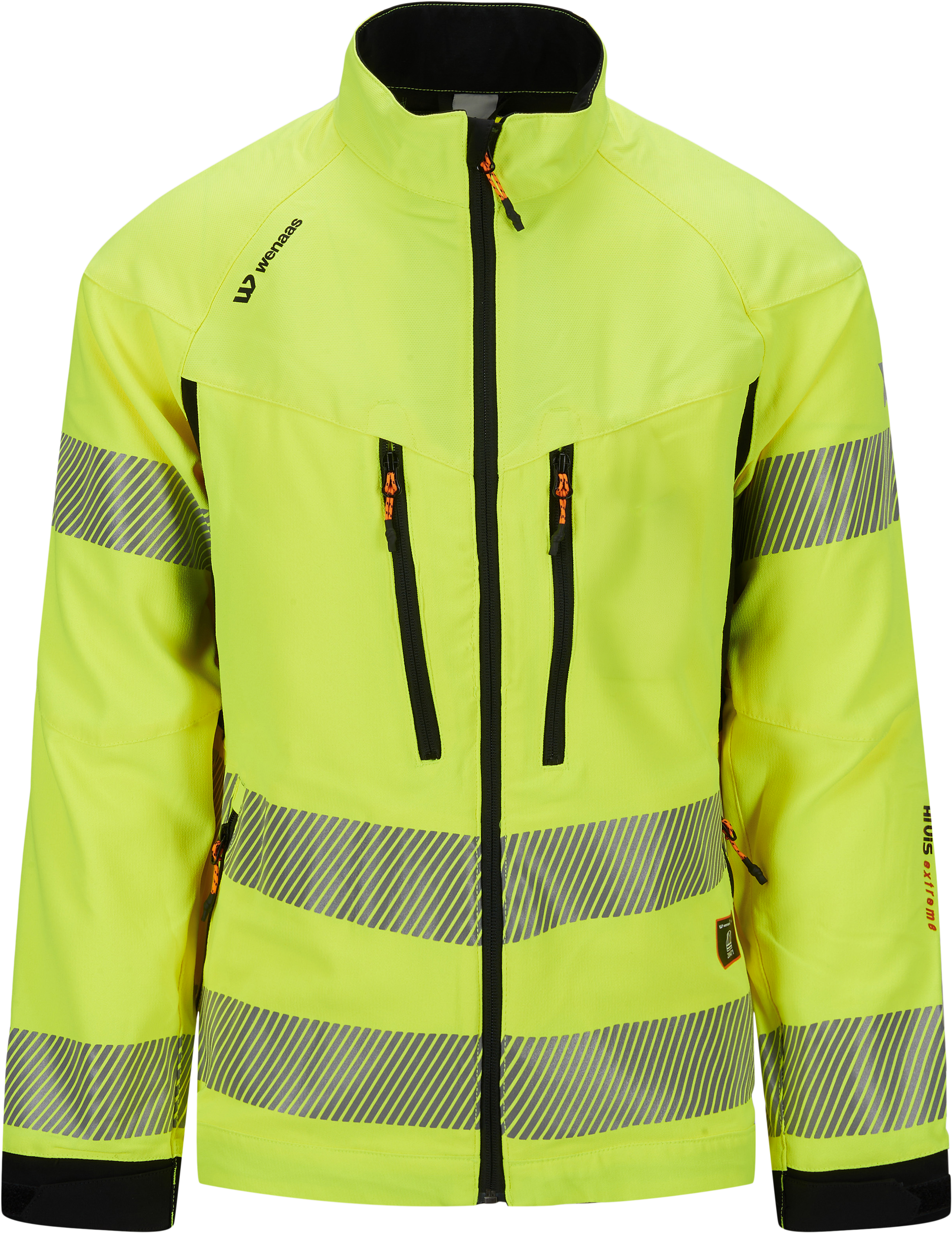 Hivis stretchjakke herremodell med en ergonomisk passform med stående krage, glidelås i front med innvendig klaff, forlenget rygg, to brystlommer med glidelås, to frontlommer med glidelås, laserhull under arm for ventilering, forsterkning på albuer og nedkant av erme, elastisk mansjett med tommelgrep, viddejustering nede på jakke og erme, refleks i to høyder på ermene og torso.