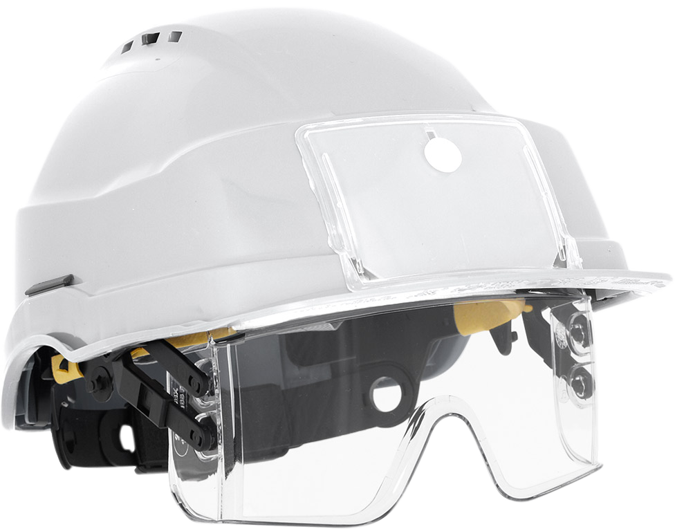 Ventilert hjelm med ID lomme i front. Ventilering kan åpnes og lukkes. 6-punkts skruinnredning. Integrert klar brille i polykarbonat som kan vippes opp i hjelmen. Plass for optisk brille under brille. Polstret komfortbånd i kunstskinn. 30 mm slissespor for montering av tilbehør. Størrelse 52-64 cm.