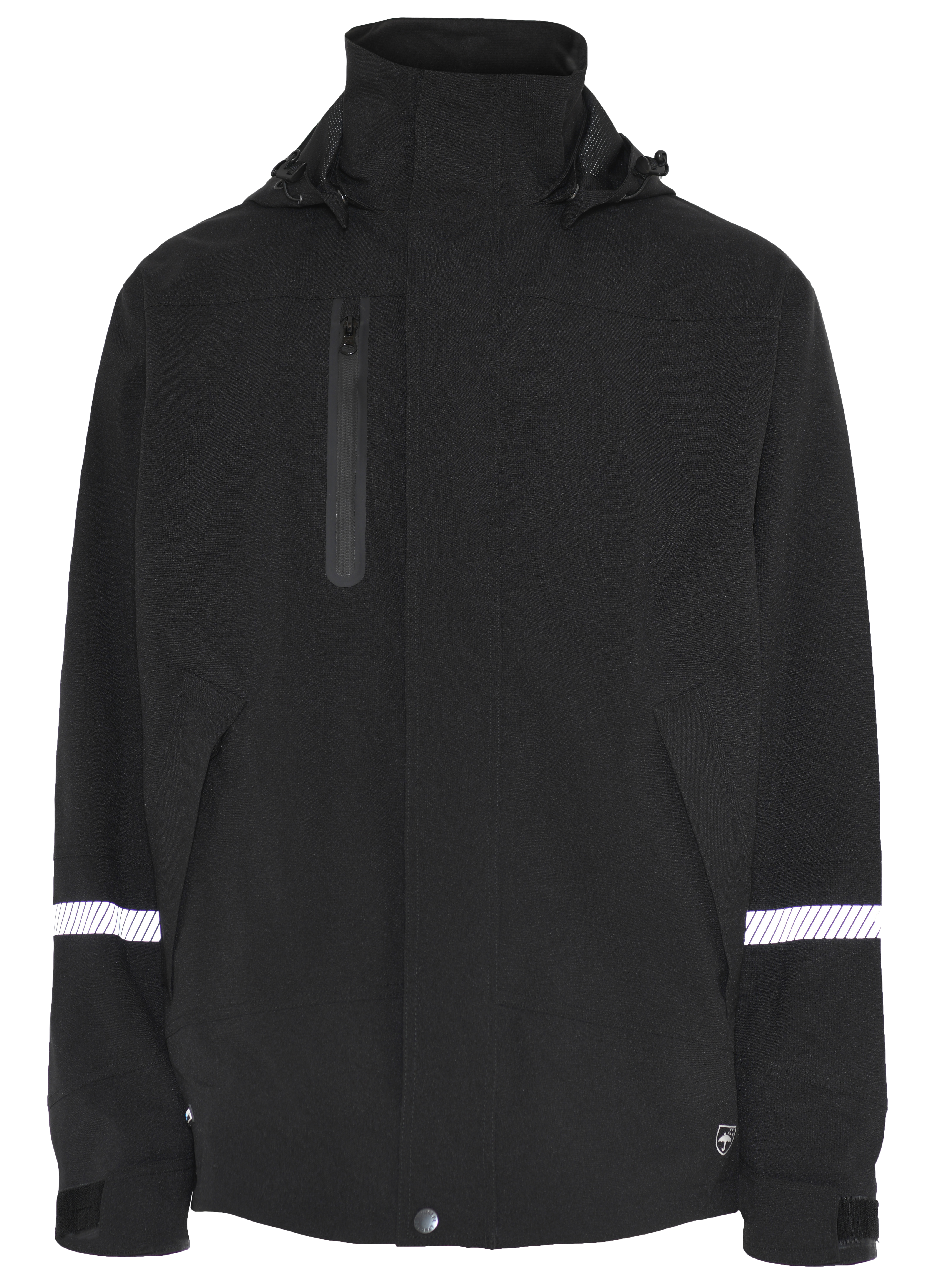 Skalljakke i pustende stretchkvalitet. Avtagbar hette med trykknapp og snor. Skjult glidelås. Borrelåsjustering ved håndledd. Elastisk klaff. To sidelommer med glidelås. En brystlomme med glidelås. Fleecefôring i nakke/hals. To innvendige lommer. En innvendig mobil-lomme inkl. hemper til headset. Avtagbar holder til ID-kort. Refleksdetaljer.
