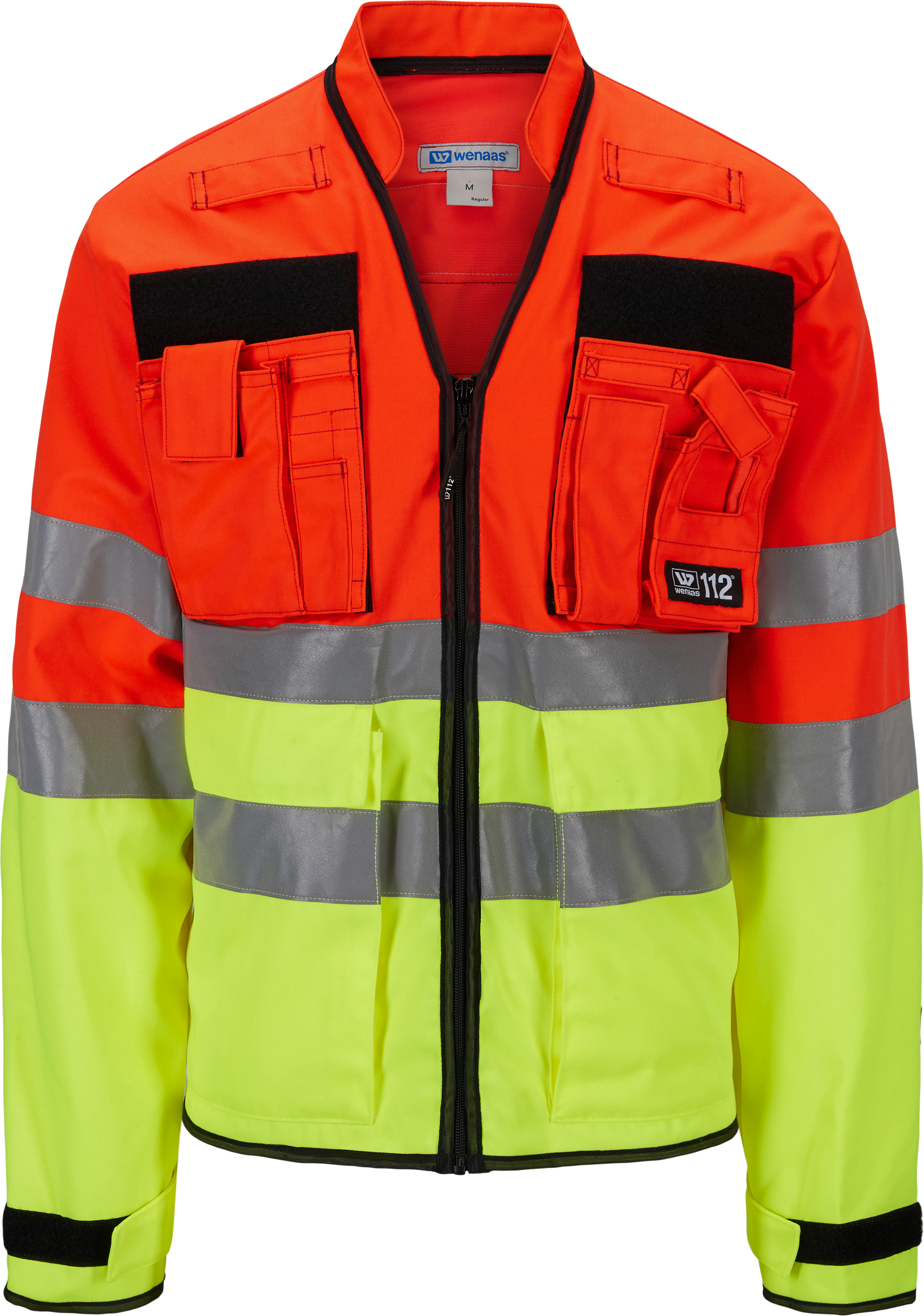 W112 vestejakke med smal stående krage og glidelås i front. Vesten har skulderklaffer og radiohempe i front på begge sider, borrelåsstriper for å feste ID-merker, avtagbar mobillomme og radiolomme med vindu, samt frontlommer med klaff og ekstra innvendige mobillomme i frontlommen. Justerbare lange ermer og inn og- utvendig justering av vidde. Pustende stoff på rygg og plass for avtakbart tekstpanel på rygg.