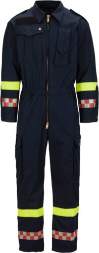 Klassisk uniformskjeledress med flammehemmende egenskaper for brannvesen. Dressen gir også beskyttelse mot flytende metall. Skulderklaffer med skjulte trykknapper, bærestykke på rygg med fold og to-veis metallglidelås i front. Mange praktiske lommer. Kile under erme for bedre bevegelighet. Strikk og justeringsmuligheter i liv gjør at dressen sitter godt. Justeringsmulighet på avslutning av erme og ben. Kjeledressen egner seg godt innenfor brann og redningsbransjen.Vis mindre
