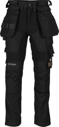 Multinorm stretchbukse, bærestykke bak, justerbar linning med ekstra høyde midt bak, store beltehemper, hammerløkke på hver side, knapp og glidelås foran, sidelommer med glidelås med mesh-ventilasjon, store avtagbare multi verktøylommer med utvendige verktøyhemper, lårlomme med utvendig lomme, begge dekket av klaff, tommestokklomme med knivknapp, hammer og knivløkke, baklommer med mesh-ventilasjon og klaff, kneputelommer for to nivåer, justerbar benvidde, 4-veis stretch.