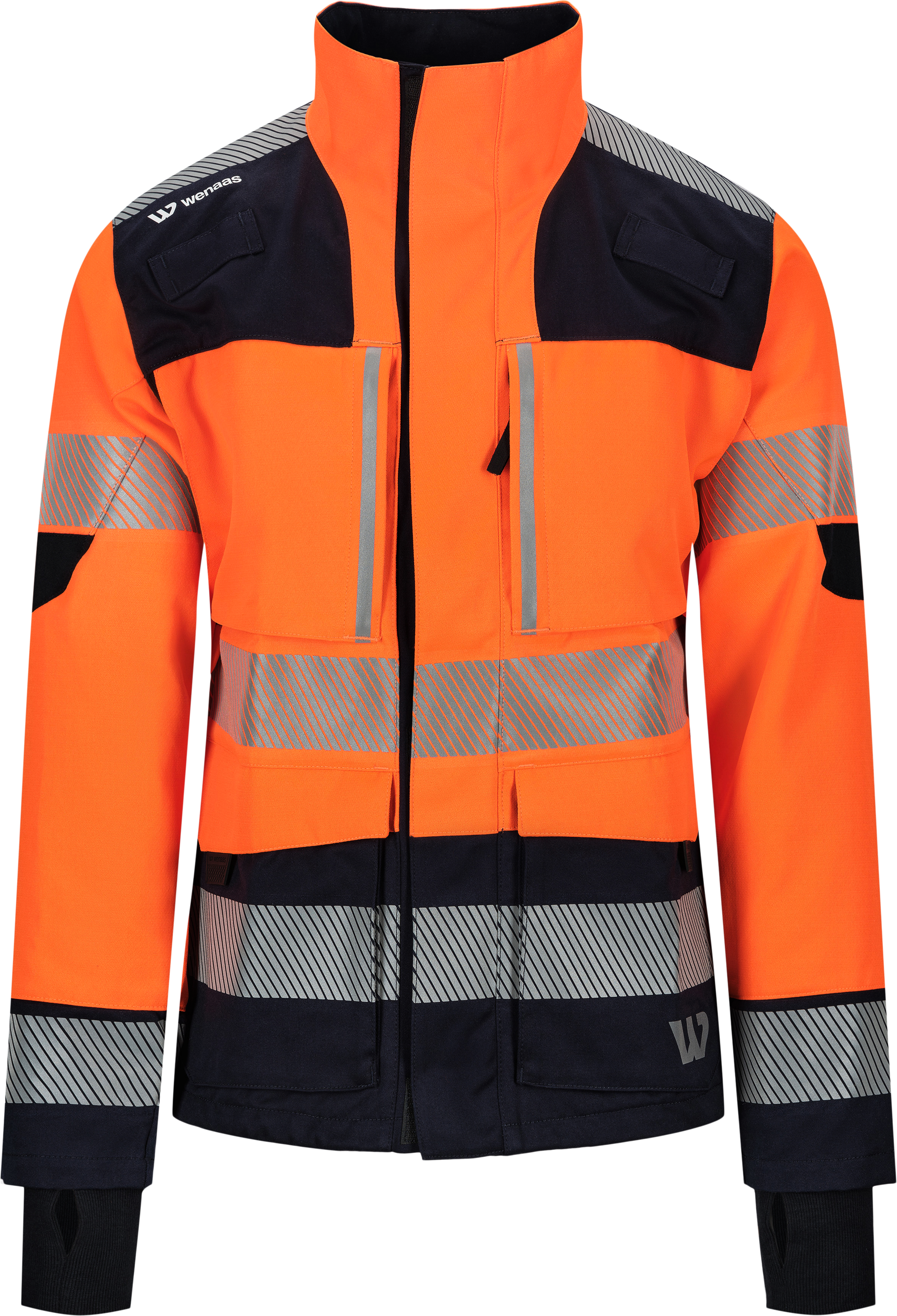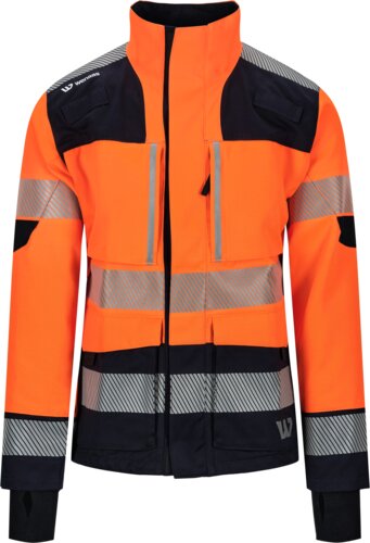 Multinorm stretchjakke dame, stående krage, glidelås foran til toppen av kragen skjult mellom frontklaffe, 4-veis stretchpanelr, radiohemper, en brystlomme med glidelås, og med tynne vertikale refleksstriper, doble frontlommer, en innvendig kartlomme og en mobiltelefonlomme, ermer med forsterkning på albuer, ribbestrikket mansjett med tommelgrepsåpning nederst på ermene, justerbar linning, to refleksbånd på ermer og kropp, og en ved skuldrene.