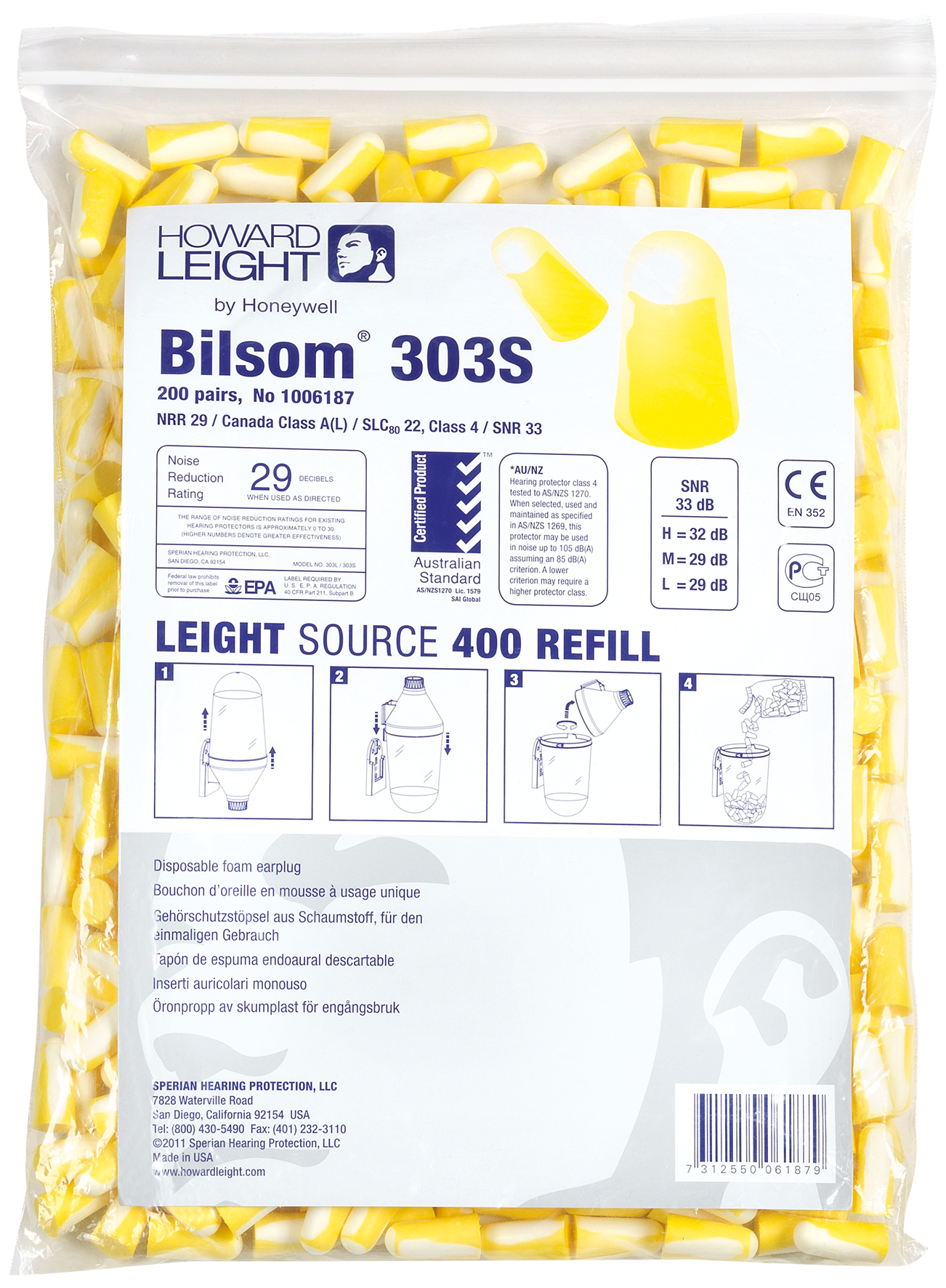 Ørepropp Bilsom 303S, small størrelse, i refillpose, lett konisk og avrundet topp som forenkler innføring i øregangen. Mykt skum som gir brukerkomfort over lang tid, og meget god ytelse. Kartong: 10 poser à 200 par.
