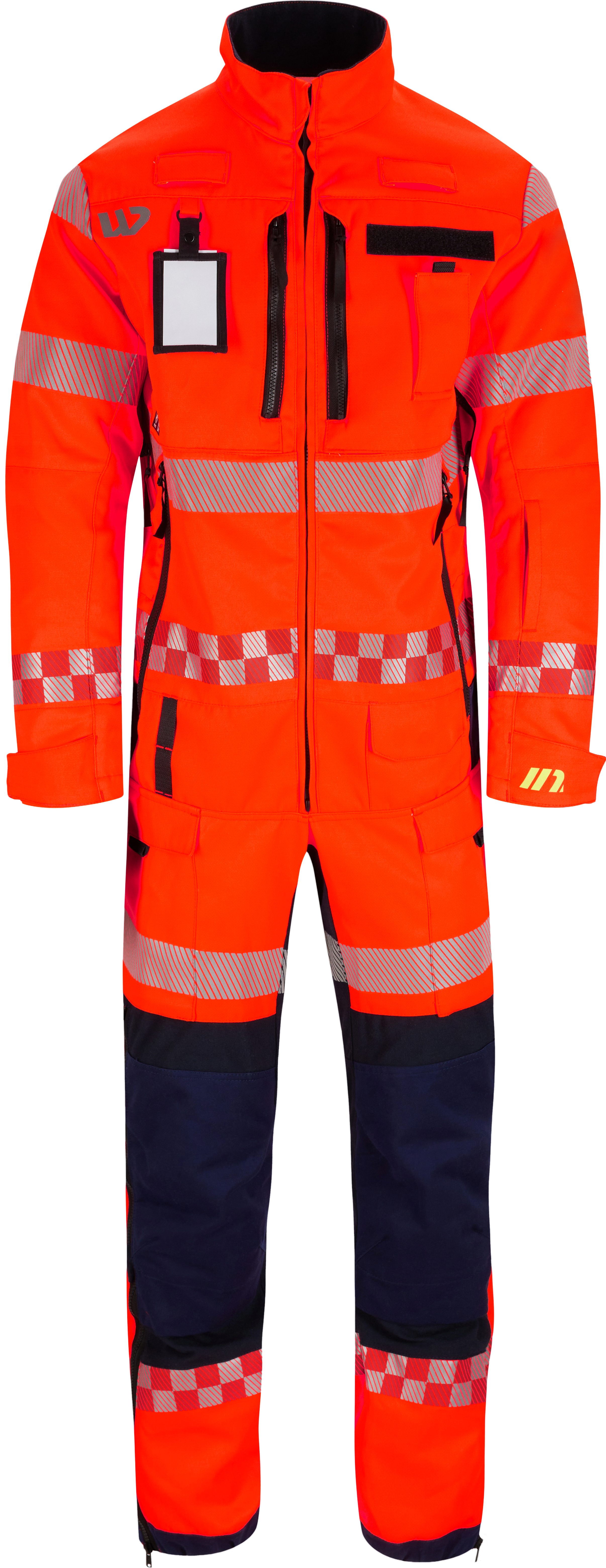Flammehemmende redningskjeledress, stående krage, bærestykke foran, skjult glidelås helt opp til kragen, glidelås dekket av to tynne frontlister, radiohempe på hver side av bærestykket, D-ring med ID-kortlomme, ventilasjonsglidelåser i armhuler, We-hemper, borrelås for feste av navn/rangmerke, brystlommer med glidelås, brystlomme med klaff, store frontlommer med glidelås, innvendig nettinglomme med glidelås, liten lomme med magnetknapp, lårlommer med klaff, ermer med forsterkede albuer, justering nederst på ermer, liten glidelåslomme venstre erme, strikk i linning bak, innvendige hemper for seler, kile i skrittet, glidelås med mesh under hver yttersøm på bena, kneputelommer for to nivåer og forsterkede kanter nederst på ben. Sølvrefleks på ermer, bryst og hofter, to-farget sølv/rød kvadratisk refleks rundt midjen og nederste deler av ermer og ben.