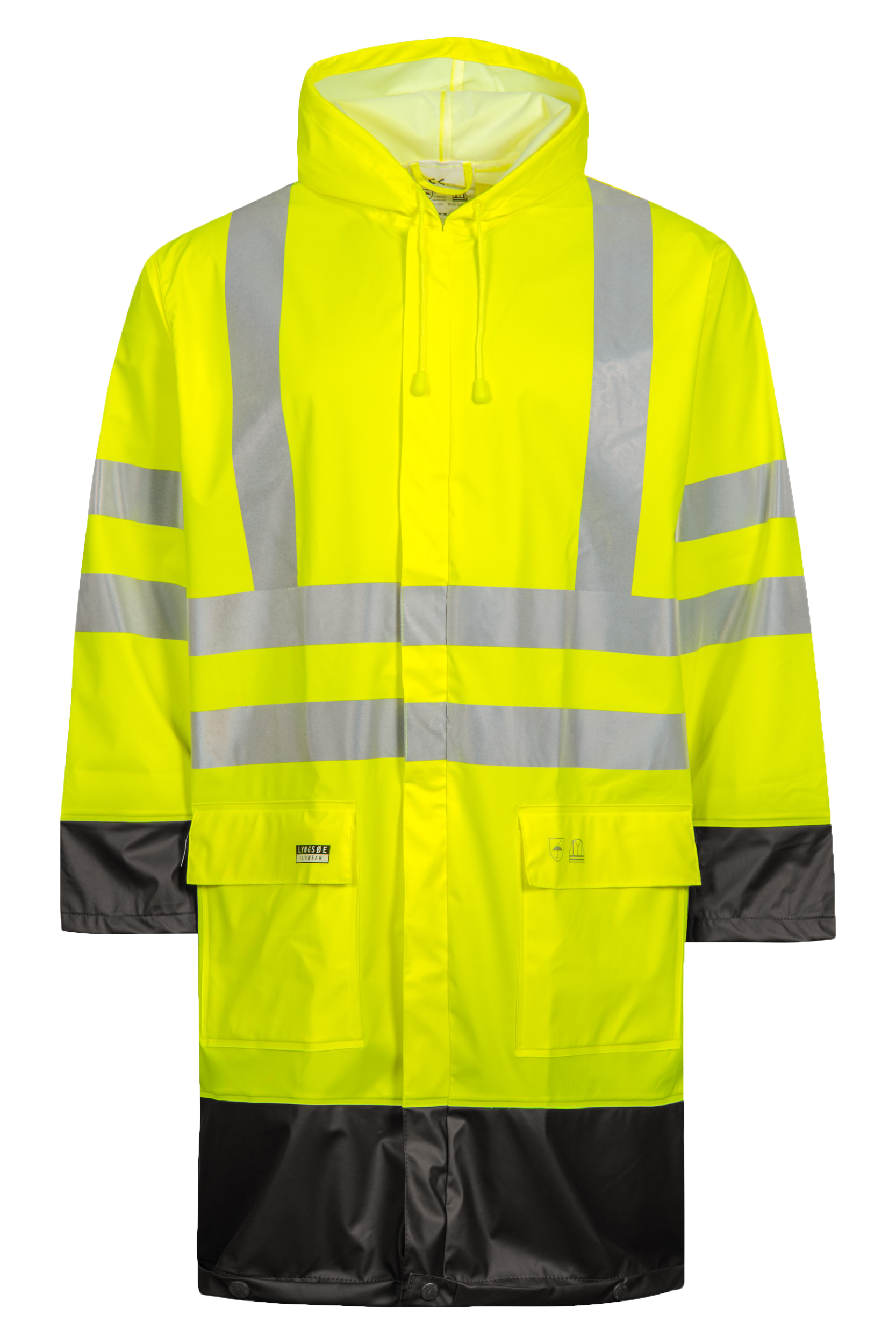 Hi-Vis regnjakke i PU kvalitet. 100 cm. Vind- og vanntett. Vanntetthet 11.000 mm. Fast hette med snor og skjult glidelås fra midjen og opp. Trykknappjustering ved håndledd. Jakken har dryppkant i bunnen og to utvendige lommer.