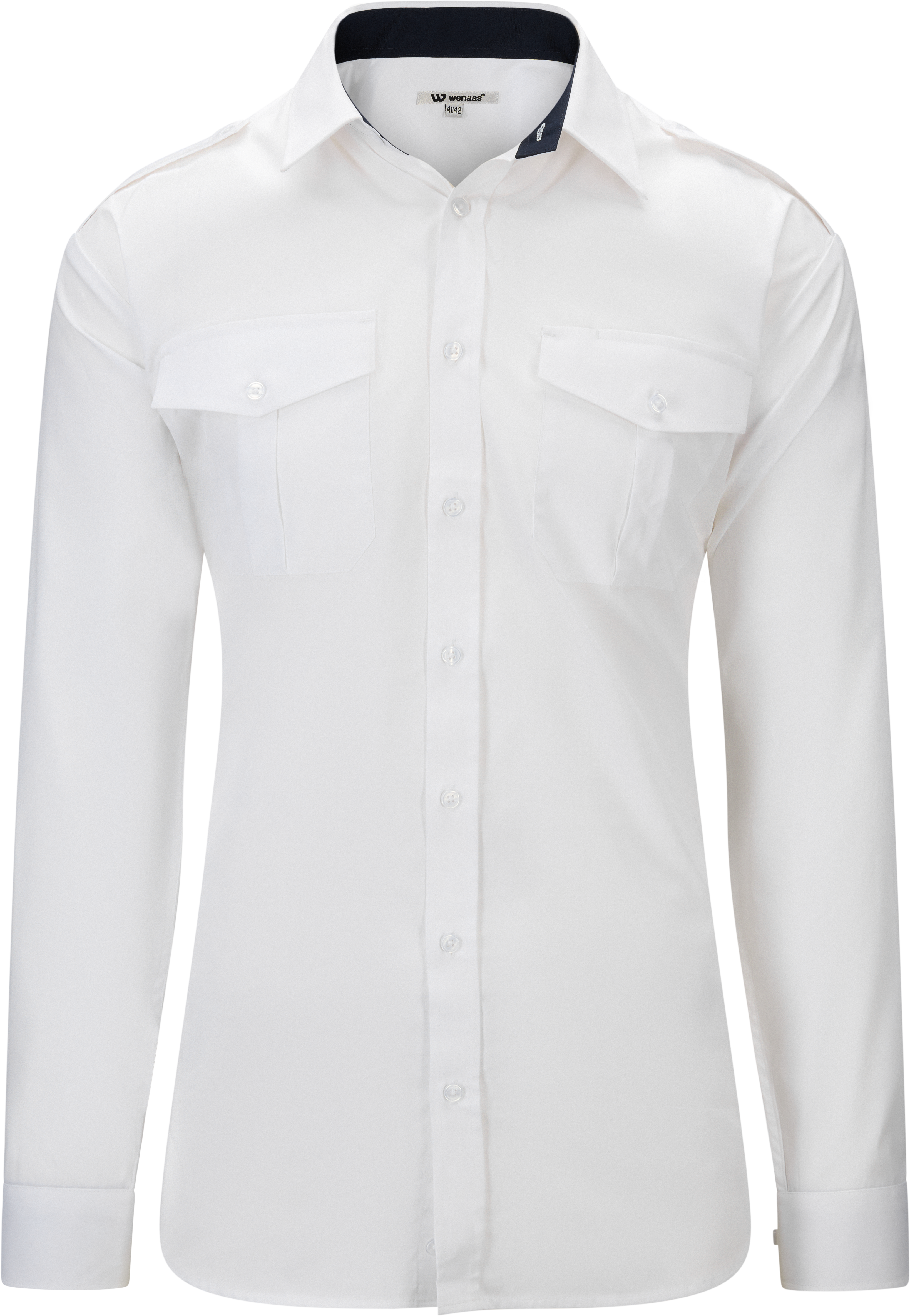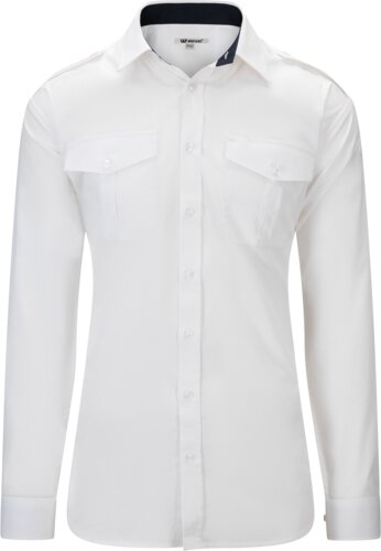 Slim fit herreskjorte med lange ermer, spiss krage, skulderklaffer, bærestykke bak, fold bak for bedre bevegelighet, stolpe foran med knapper, mansjetter og ermslisser med knapper, brystlommer med klaff og knappelukking, buet nederkant foran og bak, kontrastfarget kragebånd og mansjetter i marineblått. ETI finish - '' Easy to iron''.