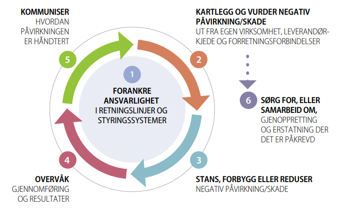 Selskaper er pålagt å offentliggjøre redegjørelsen for deres aktsomhetsvurdering for første gang innen 30. juni 2023. Loven sikrer også at allmennheten har tilstrekkelig tilgang til informasjonen. Aktsomhetsvurderinger regnes som den internasjonale gullstandarden for godt samfunnsansvar. Prosessen er i henhold til OECDs retningslinjer for aktsomhetsvurderinger for ansvarlig næringsliv og kartlegges i samsvar med følgende prinsipper som vist i figur.
