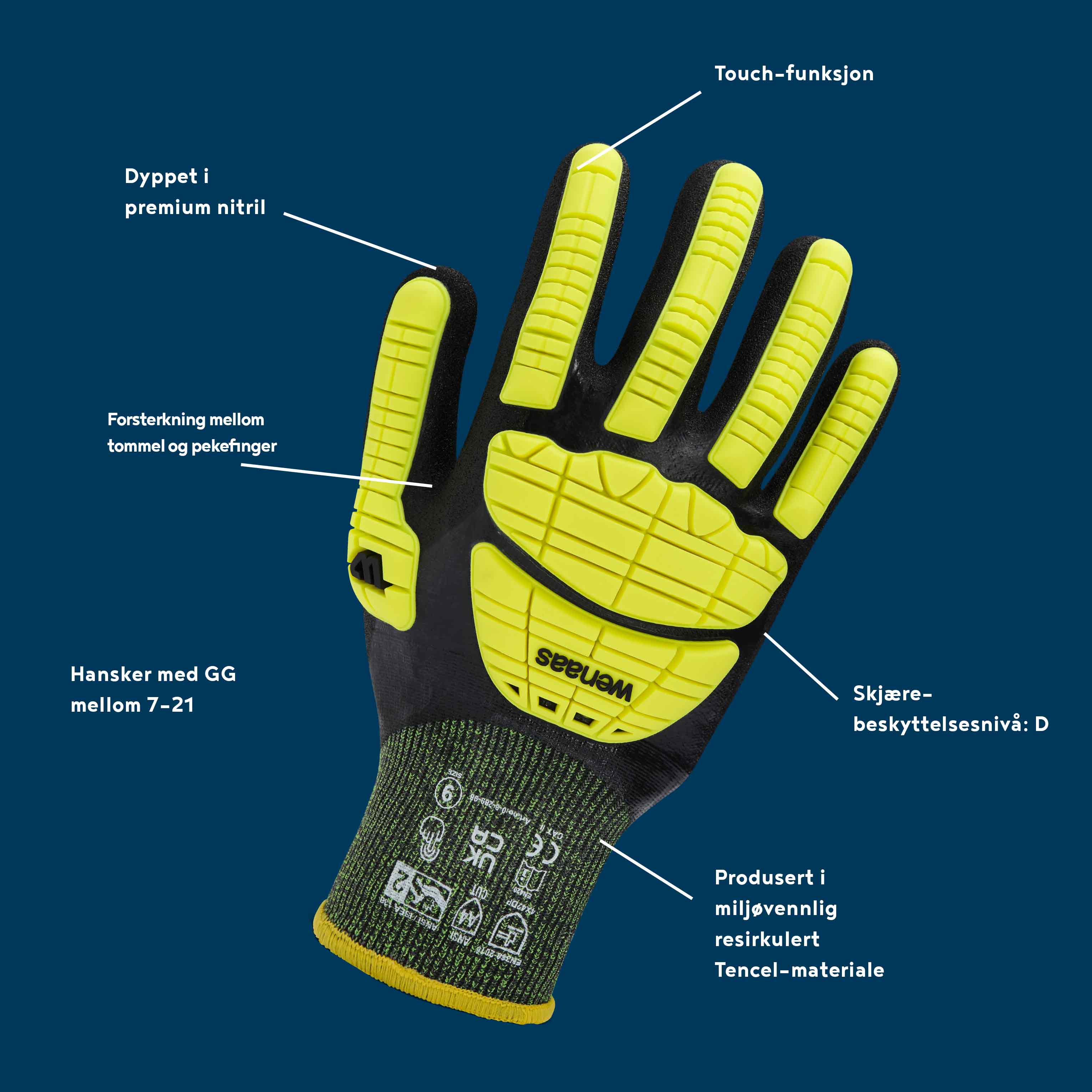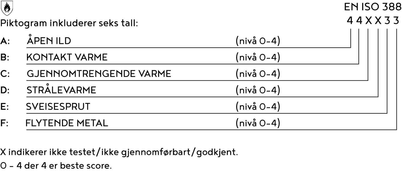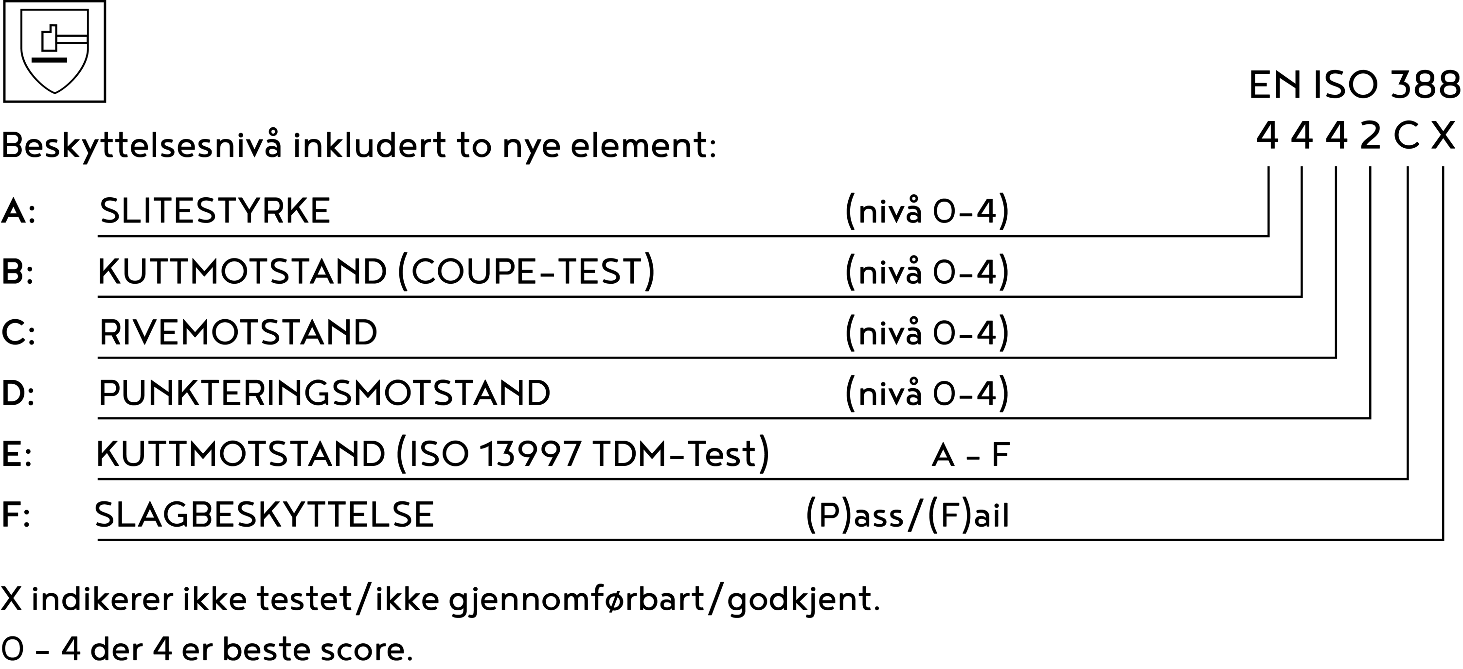 - Piktogrammer over gjeldende standarder for hansken, med referanse- og ytelsesnivåer