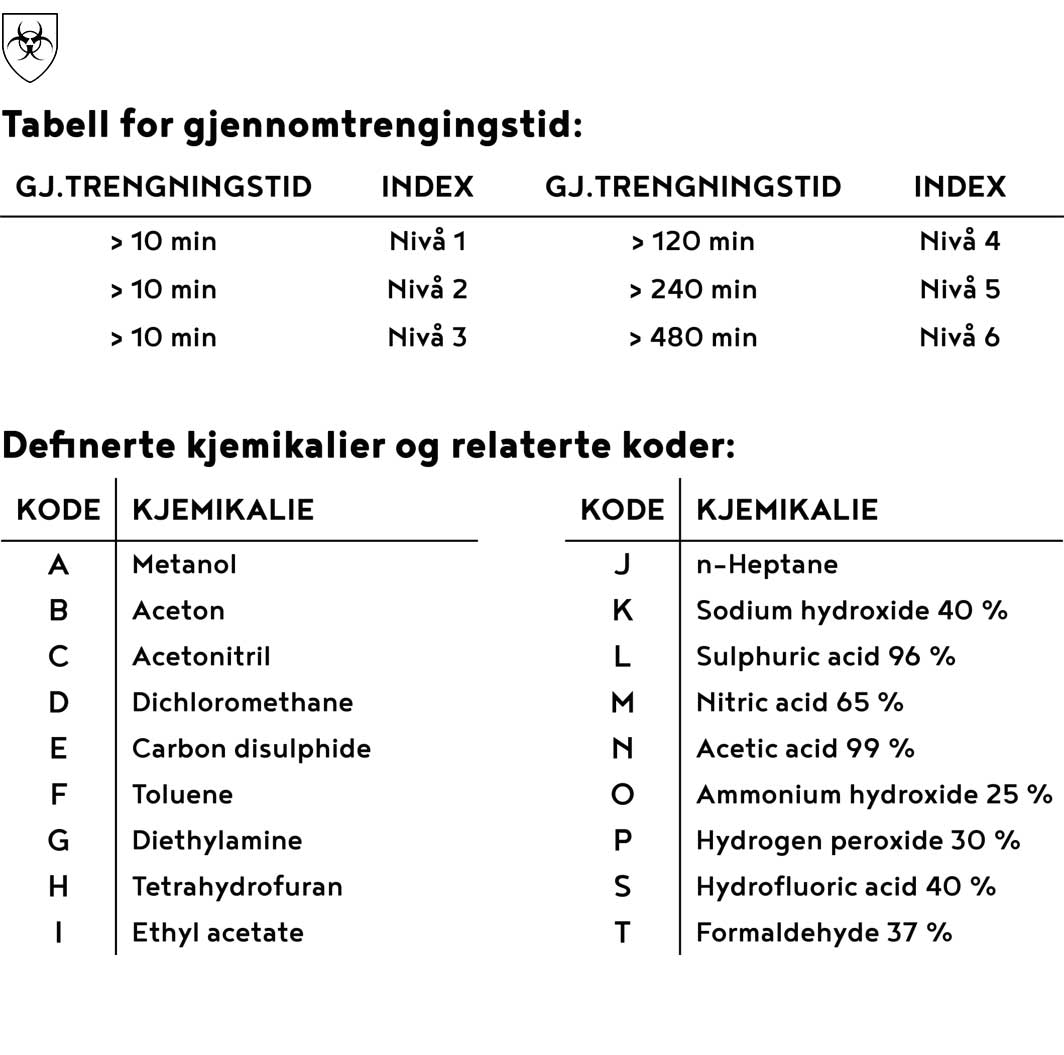Det er viktig å velge hansker som passer til spesifikke kjemikalier og farer i arbeidsmiljøet ditt. Tabellen over kjemikalieresistens (både gjennombruddstid og degradering) bør alltid konsulteres før bruk.