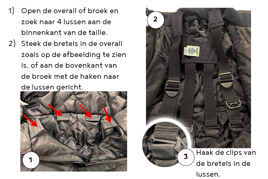 Wenaas heeft eigen bretels die je kunt gebruiken in zowel de winter- als zomeroverall. Deze worden vastgehaakt aan enkele lussen die je in jouw Wenaas-overall kunt vinden. Wanneer je de bretels in de overall hebt bevestigd en deze hebt afgesteld op de juiste lengte in verhouding tot jouw lichaam en de maat van de overall die je draagt, zul je duidelijk merken dat de overall beter zit. De bretels verlichten en verdelen het gewicht van de overall op een geheel andere manier. Het resultaat is dat de overall aanzienlijk comfortabeler aanvoelt, wat het draagcomfort verhoogt.