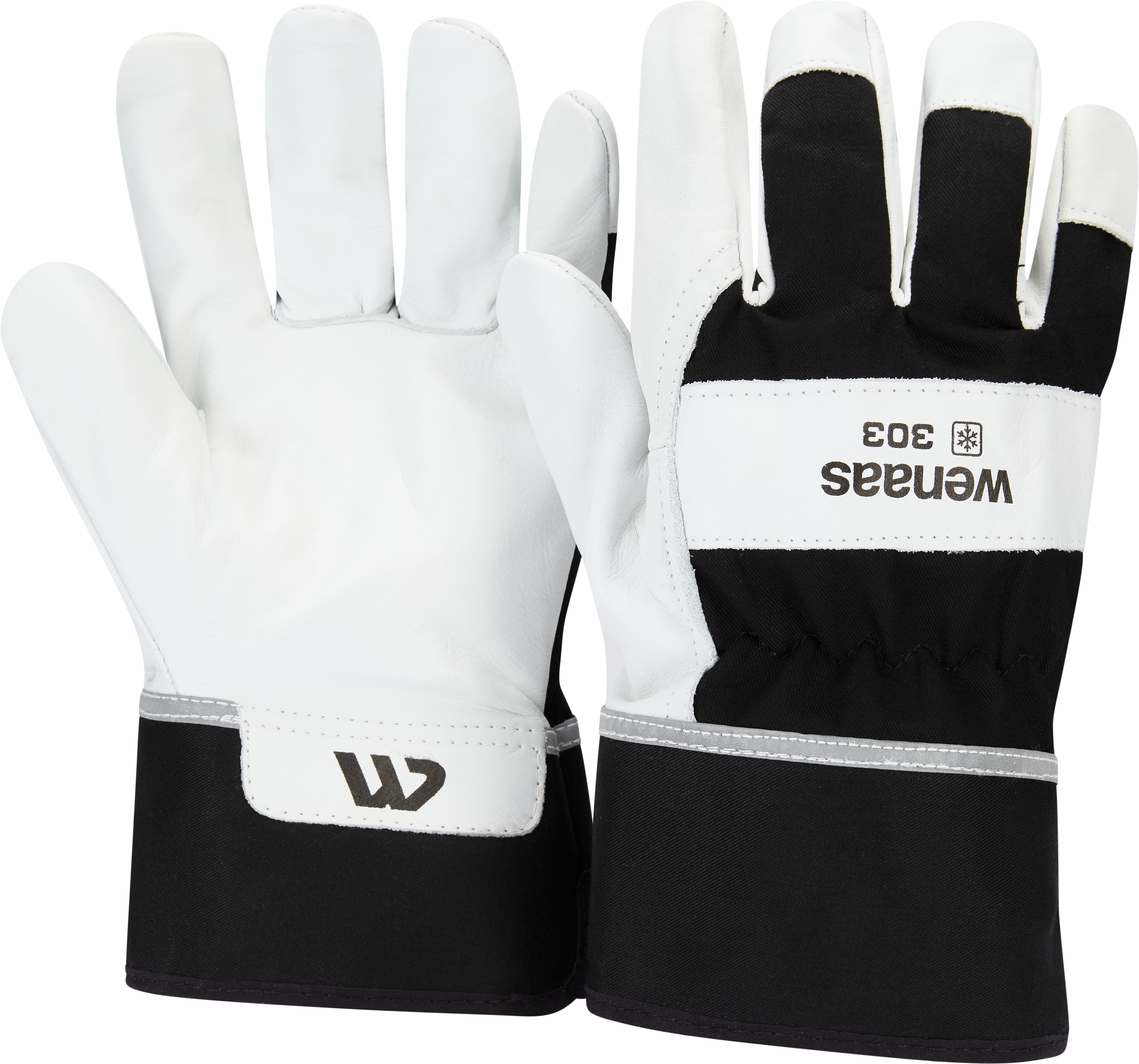 Stevige winterhandschoenen van runderleer met katoen op de rug van de hand. Volledig gevoerd met synthetische vacht. Veiligheidskraag, versterkte vingers en waterafstotende palm. Voor zwaar werk. Bundel: 6 - Doos: 72.