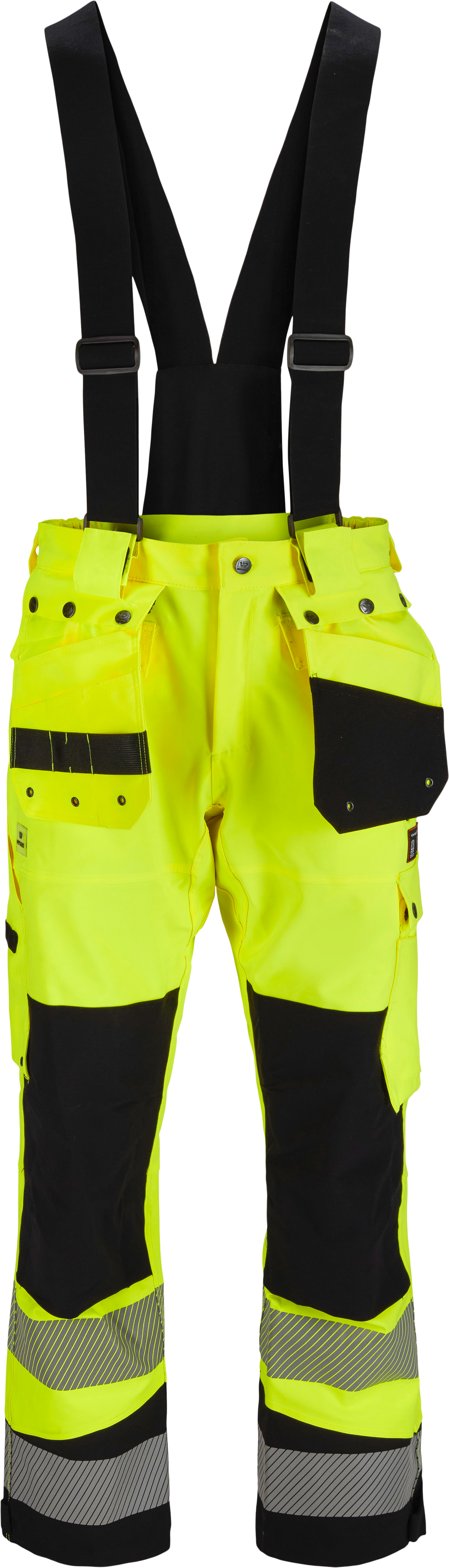 Zichtbaarheidsklasse 2. Reflecterende banden rond de benen bieden hoge zichtbaarheid. Wind- en waterdicht met getapete elastische naden en ademend vermogen van 10000 g/m²/24h. Kniezakken voor bescherming en duurzaam materiaal voor zware werkomstandigheden. Verstelbare en afneembare bretels en hangende gereedschapszakken bieden flexibiliteit.