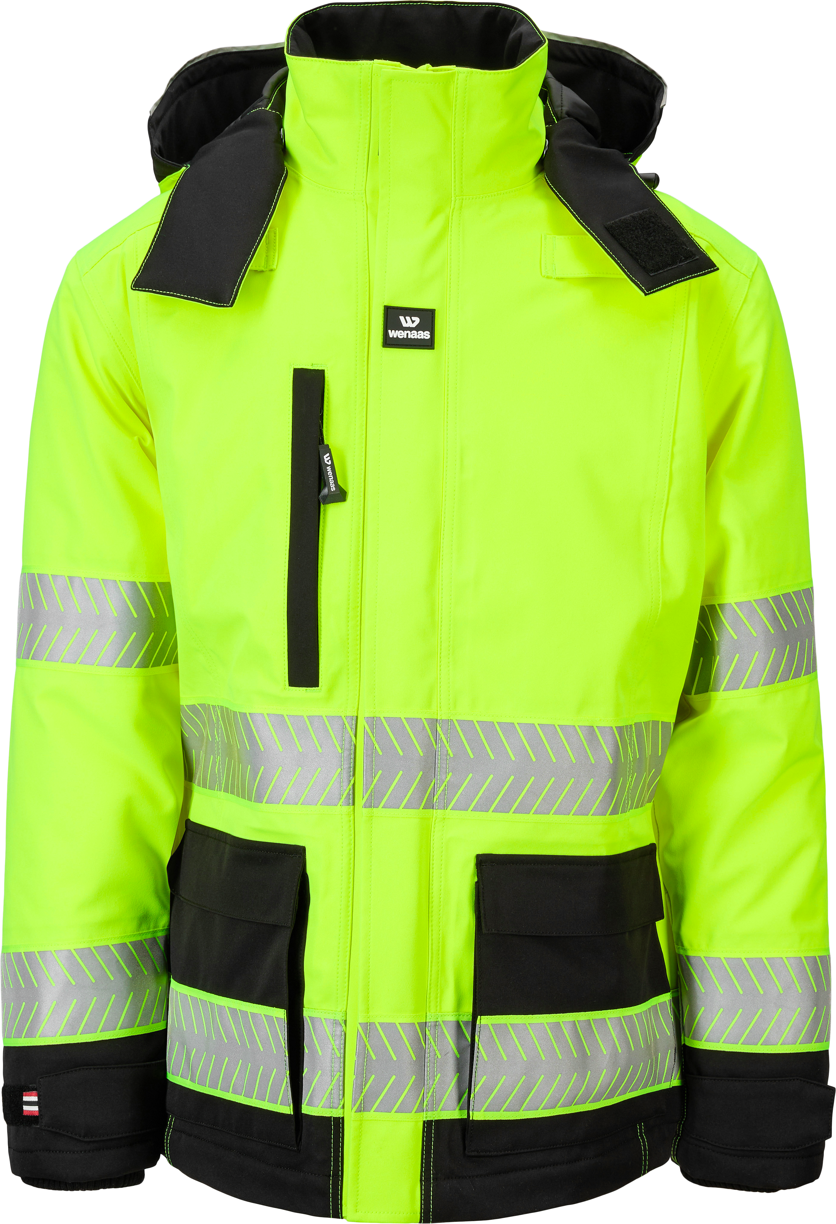 Waterdichte winterjas voor dames goedgekeurd voor zichtbaarheid klasse 3. Jas met opstaande kraag, ritssluiting en gewatteerde voering die je warm houdt bij lage temperaturen. Voorzien van elastische bretels, geïnspireerd op skikleding, voor flexibiliteit en ventilatie zonder de jas uit te hoeven trekken. Getapete naden bieden extra bescherming tegen wind en regen. De grote, afneembare capuchon past over een helm. De jas heeft radiohouders op beide borstzakken, een kaartzak onder de voorflap, een borstzak aan de rechterkant en voorzakken aan beide zijden. De onderste zakken zijn open en hebben een elastische bovenkant voor veilige opslag.