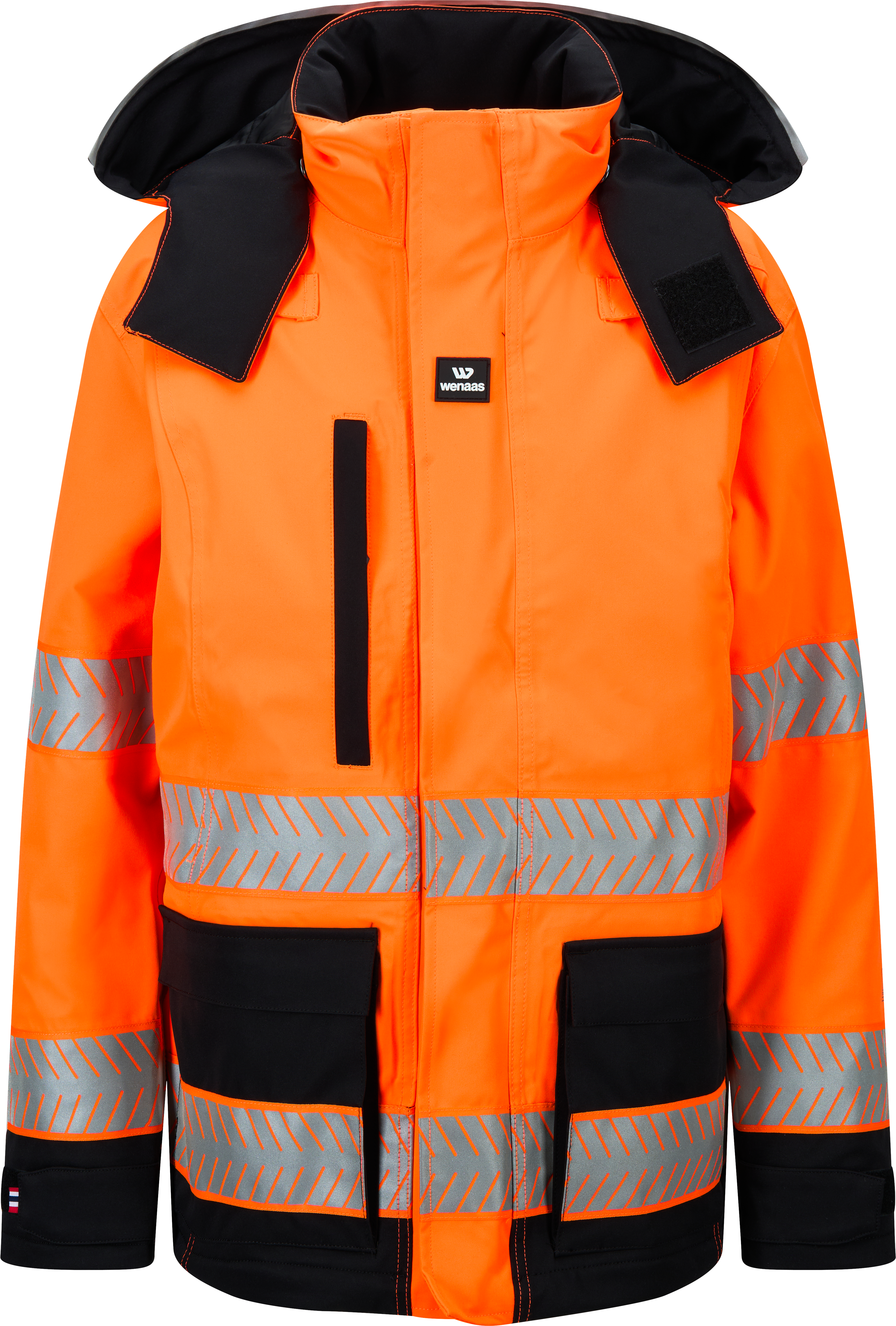 Waterdichte winterjas voor dames goedgekeurd voor zichtbaarheid klasse 3. Jas met opstaande kraag, ritssluiting en gewatteerde voering die je warm houdt bij lage temperaturen. Voorzien van elastische bretels, geïnspireerd op skikleding, voor flexibiliteit en ventilatie zonder de jas uit te hoeven trekken. Getapete naden bieden extra bescherming tegen wind en regen. De grote, afneembare capuchon past over een helm. De jas heeft radiohouders op beide borstzakken, een kaartzak onder de voorflap, een borstzak aan de rechterkant en voorzakken aan beide zijden. De onderste zakken zijn open en hebben een elastische bovenkant voor veilige opslag.
