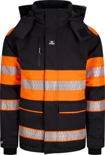 Waterdichte winterjas goedgekeurd voor zichtbaarheid klasse 1. Jas met opstaande kraag, ritssluiting en gewatteerde voering die je warm houdt bij lage temperaturen. Voorzien van elastische bretels, geïnspireerd op skikleding, voor flexibiliteit en ventilatie zonder de jas uit te hoeven trekken. Getapete naden bieden extra bescherming tegen wind en regen. De grote, afneembare capuchon past over een helm. De jas heeft radiohouders op beide borstzakken, een kaartzak onder de voorflap, een borstzak aan de rechterkant en voorzakken aan beide zijden. De onderste zakken zijn open en hebben een elastische bovenkant voor veilige opslag.