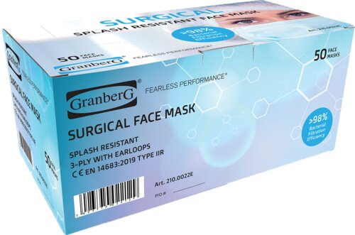 Chirurgisch gezichtsmasker met volledige bescherming tegen spatten van bloed en lichaamsvloeistoffen. Ademend, 3-laags materiaal. Zachte oorlussen. >98% filtratie van deeltjes, 100% latexvrij. Geschikt voor medisch gebruik. Verpakking: 20 dozen van elk 50 stuks.