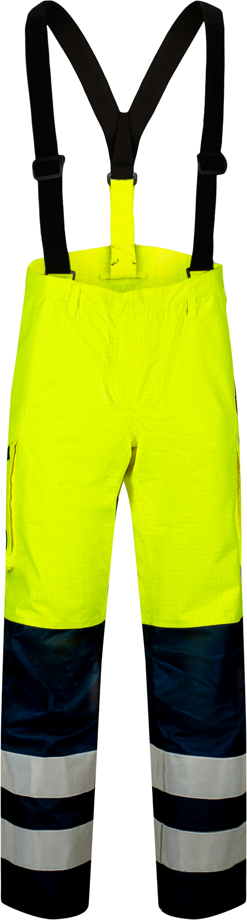 Taps toelopende naden, langere tailleband achter, lussen om afneembare bretels aan te bevestigen, zes riembanden, gulp met rits onder flap, twee verborgen drukknopen, twee dijbeenzakken met rits onder flap, een lus met een D-ring, kniestukzakken met twee niveaus voor kniebeschermers, rits onder dubbele flap, verstelbare zomen en dubbele reflecterende banden rond de benen.