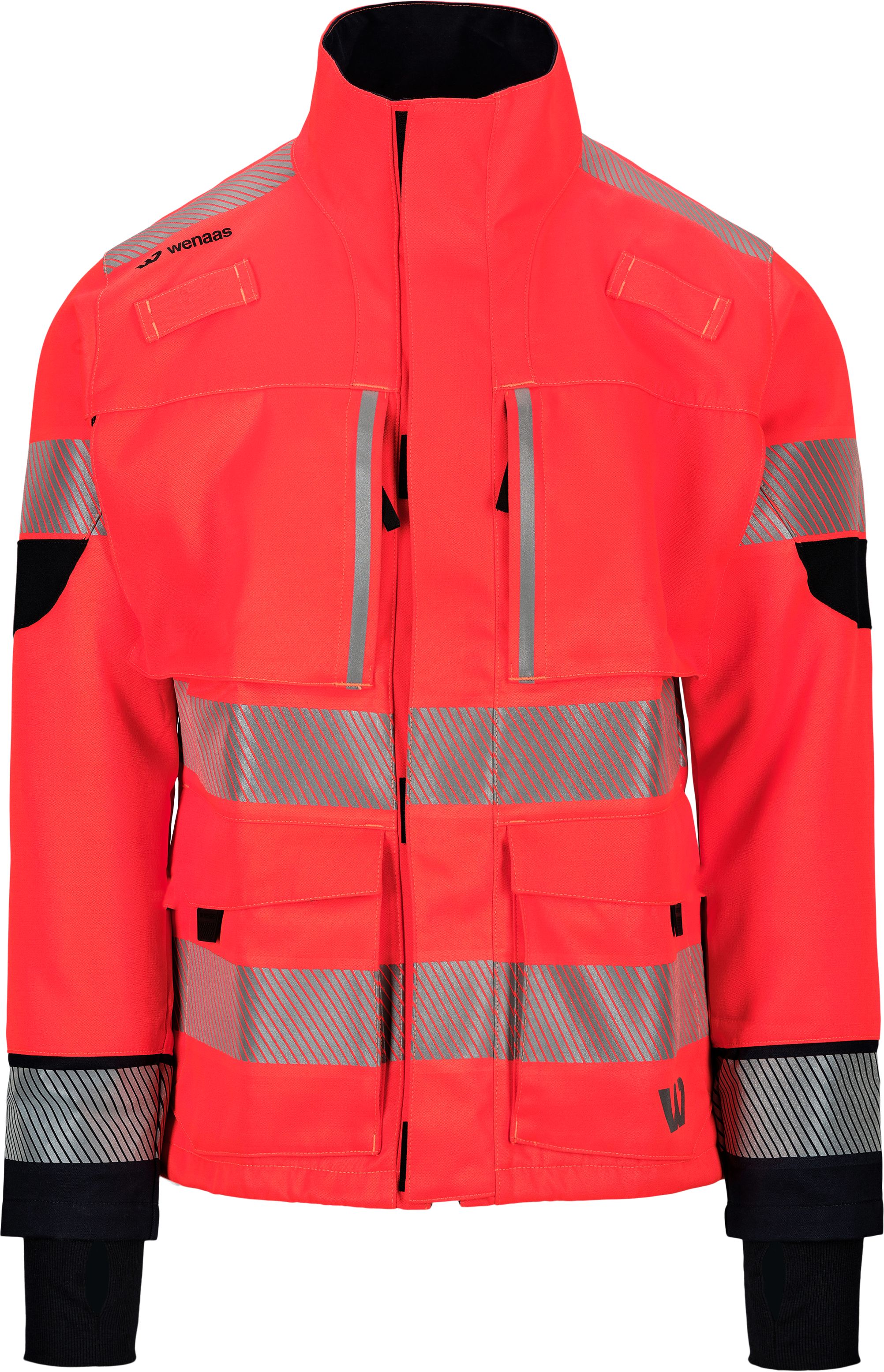 Multinorm stretchjas, opstaande kraag, ritssluiting voorkant naar top kraag verborgen tussen voorflappen, 4-way stretchpanelen, radiozakken, een borstzak met ritssluiting, en met dunne verticale reflectiestrepen, dubbele voorzakken, aan de binnenkant een kaartenzak en telefoonzak, mouwen met versteviging bij de ellebogen, geribde manchetten met duimgaten aan de uiteinden van de mouwen, verstelbare tailleband, twee reflectiebanden op de armen en het lichaam en één bij de schouders.