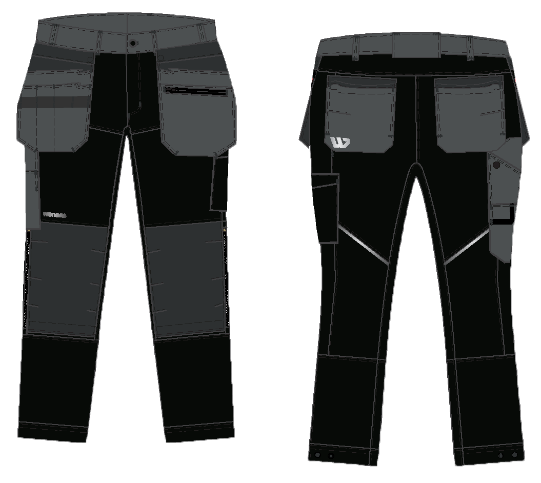 Werkbroek met een tailleband voorzien van riemlussen en elastiek aan de zijkanten, knoopsluiting en ritssluiting in de gulp, inzetstuk in het kruis, achterpas, zijzakken en dubbele afneembare spijkerzakken met versteviging en gereedschapslussen. De ritssluiting is afgedekt met een klep. Achterzakken, dubbele duimstokzak met drukknoop en lus. Telefoonzak met klep, kniezakken met twee niveaus, ritsen aan de zijkanten van de pijpen met mesh voor ventilatie. Reflecterende details. Breedte- en lengteverstelling onderaan de pijpen en extra verlengingszoom.