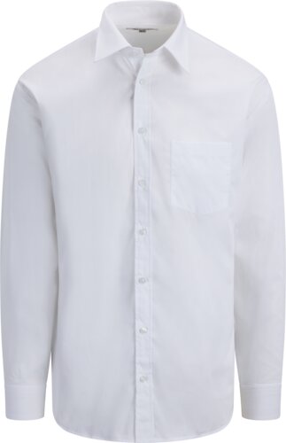 This shirt has a pointed collar and a collar stand. The front placket closes with buttons. Yoke at the back that goes towards the front on the shoulder, pleats at the back for better movement, and a curved bottom edge at the front and back. Long sleeves with a slit and cuff, closed with buttons. One chest pocket on the left side.