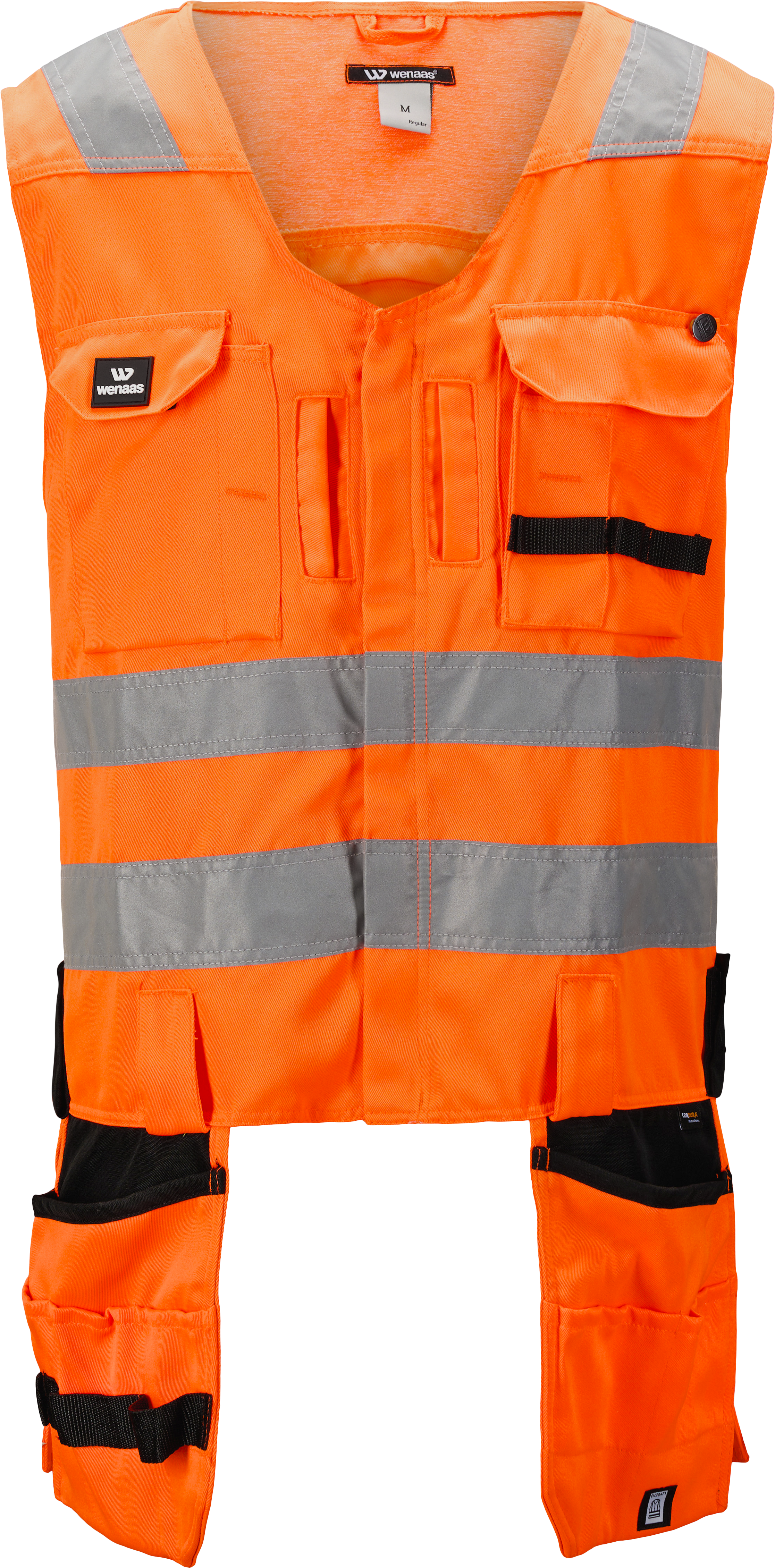 Reflecterend hesje, geschikt voor werken op hoogte, reflecterend paneel over de schouders en rond de romp, verborgen ritssluiting met extra breedte-optie bevestigd aan buitenrits, Cordura®-gereedschapshouders, brede riemlussen, twee borstzakken met klep en Velcro® sluiting, rechterzak te vergroten, zakje voor ID-bewijs en potloodzak, linkerzak heeft uitbreidbare vouw onderaan en aan beide zijkanten, potloodzak en knoop voor messleuf, vier Cordura®-hangzakken, de rechter voorzak heeft een grote zak en drie kleinere zakken aan de buitenkant, de buitenkant van de zak heeft webbing van twee verschillende breedtes, de linkerzak heeft een grote zak en twee kleinere zakken, verlengd achterstuk, mesh aan de achterzijde voor ventilatie.