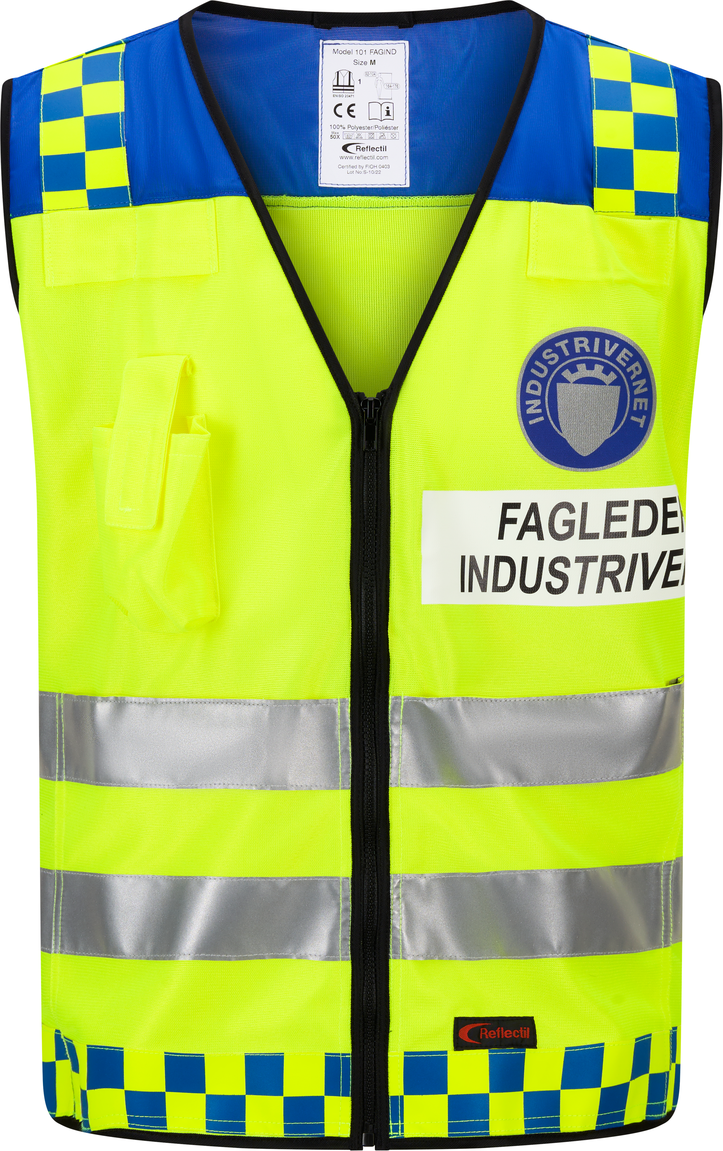 Reflecterend vest met V-hals, rits in de voorkant, één radiolus aan beide zijden, één radiozak met een kleine klep aan de rechterkant, twee voorzakken met verborgen opening onder het reflecterende paneel, één grijs reflecterend paneel en één blauw met geel geruit reflecterend paneel rondom de romp, logo op borst en rug.