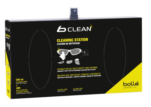 Reinigingsstation voor stofbrillen en brillen. Verpakking met 250 ml lensreiniger op waterbasis, zonder alcohol en siliconen, en 400 reinigingsdoekjes. Gewicht 423 gram. Bewaren op een schone, droge plaats. Verpakking met 20 stuks.