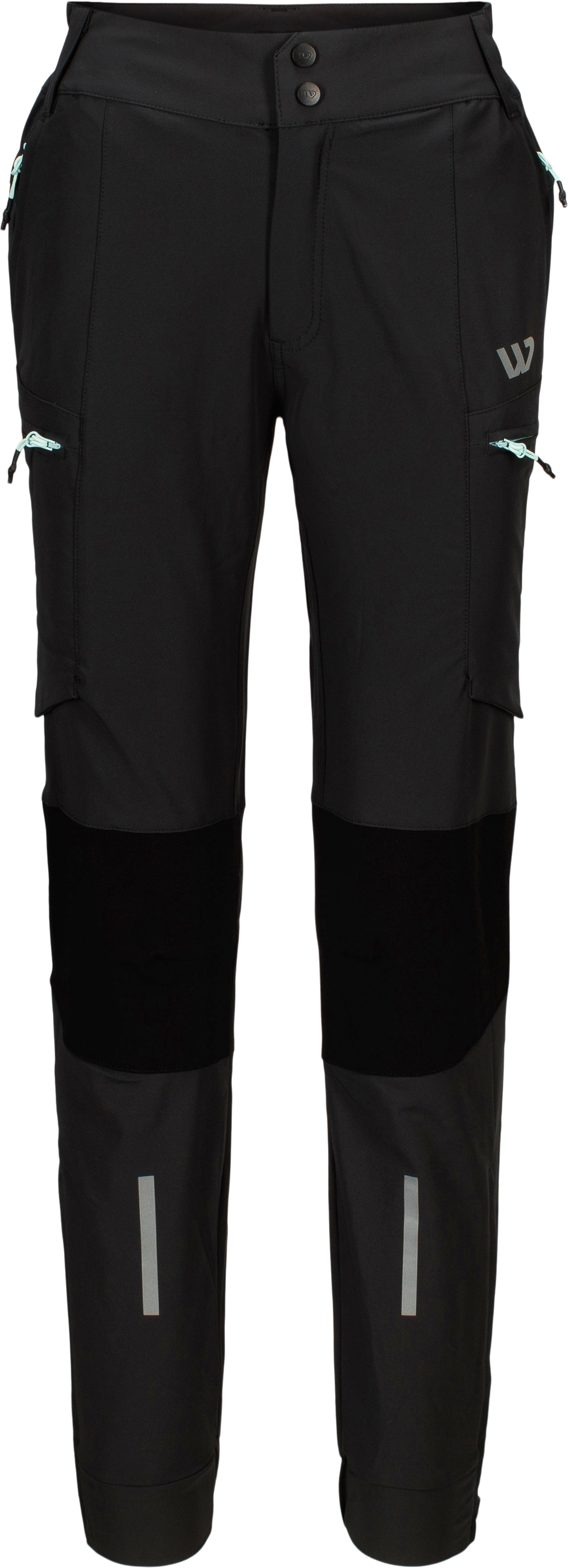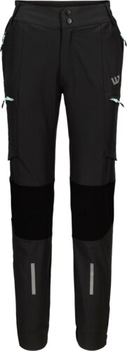 Softshell broek van twee soorten elastisch materiaal, voering met elastiek aan de zijkanten, vier grote riemlussen, rits op de gulp en twee knopen op de voorkant. Panelen aan beide zijkanten, twee grote zijzakken met rits, twee grote zakken aan voorkant met rits en verlengde bodem op de zakken. Verstevigingsstof op de knieën, oogjes aan achterkant van de knie. Rits aan de pijpen om de zomen te verstellen. Reflecterende details