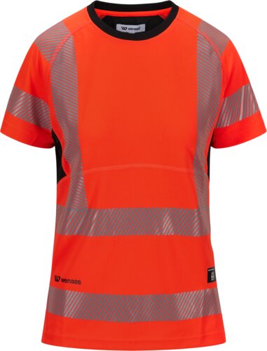 Ergonomisch T-shirt met hoge zichtbaarheid van vochtafvoerend mesh-materiaal, met korte mouwen, contrasterende ronde neklijn en extra ventilerend pand in de nek en onder de armen, met gesegmenteerde reflecterende band op romp, armen en schouders.