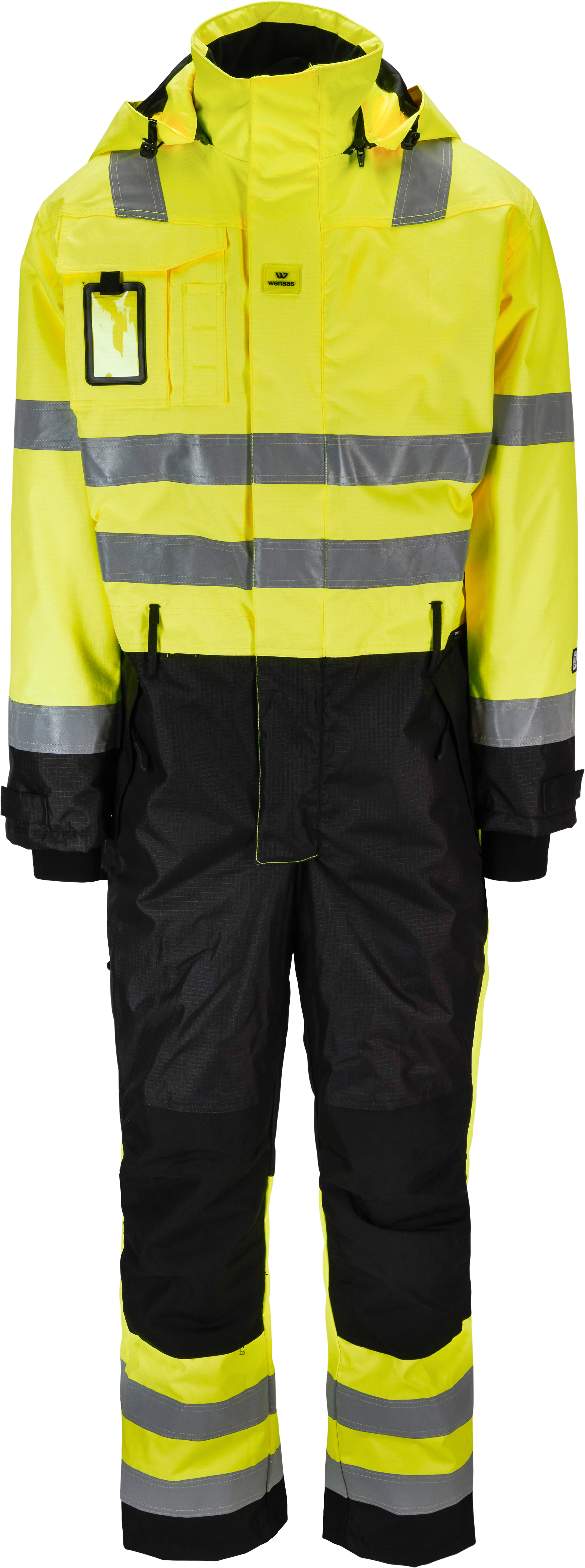 Doorgestikte overall met goede zichtbaarheid voor koude dagen. Met membraan gecoate stof en getapete naden garanderen dat deze overalls winddicht en waterafstotend zijn. Tweewegrits aan de voorkant en veel praktische zakken op de voor- en achterkant. Opstaande kraag met zachte fleece en grote, afneembare, capuchon met ruimte voor een helm. Gebreide stof in de romp zorgt voor een goede pasvorm. Haakjes voor bretels in de binnenkant van de taille. CORDURA®-kniebeschermerzakken op twee hoogten. Klittenbandstroken in de boorden en manchetten voor aanpassing van de breedte en ribstof in de manchetten. Toon minder