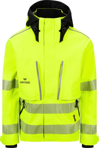 Drie-laags jas goedgekeurd voor zichtbaarheidsklasse 3. De jas heeft getapete naden die beschermen tegen weer en wind, een hoge kraag en een afneembare capuchon die geschikt is voor helmgebruik. Een verborgen ritssluiting onder een stormflap voorkomt windinfiltratie. Ventilatieopeningen onder de armen met een flap zorgen voor eenvoudige temperatuurregeling. Praktische zakken, versterkte ellebogen en verstelbare mouwen met rib en duimopening bieden flexibiliteit en comfort. Reflecterende banden rond het lichaam en de mouwen zorgen voor hoge zichtbaarheid.