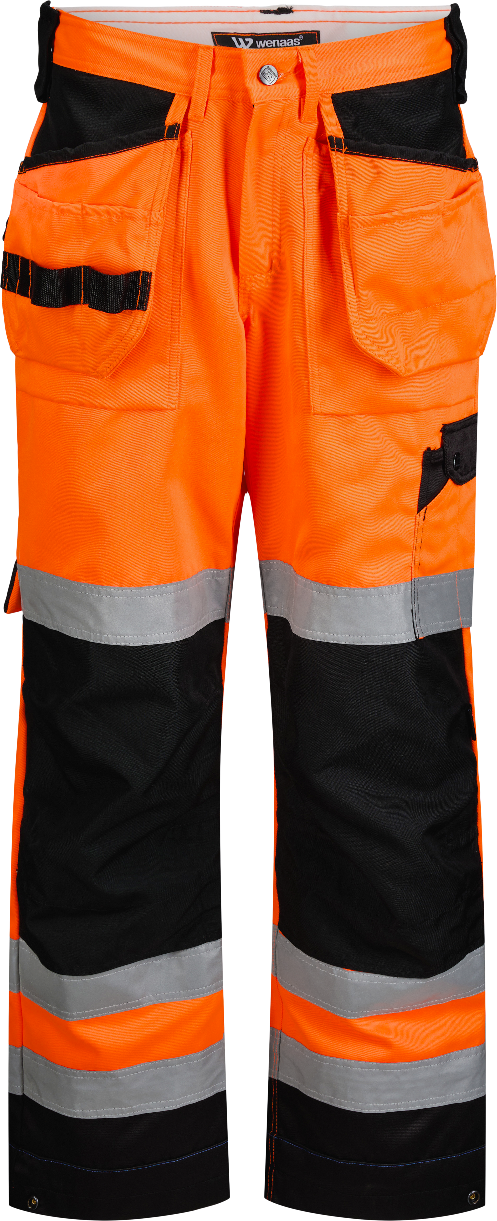 Werkbroek goedgekeurd voor zichtbaarheidsklasse 2. Slijtvaste broek met tailleband, riemlussen en ritssluiting. Dubbele hangende zakken, achterzakken en een hamerlus onder de rechterachterzak. Duimstokzak met hamerlus en meshouder, dubbele heupzak en kniezakken. Reflecterende banden op de dijen en dubbele reflecterende banden rond de benen. Verstelbare beenwijdte en extra stof voor verlenging.