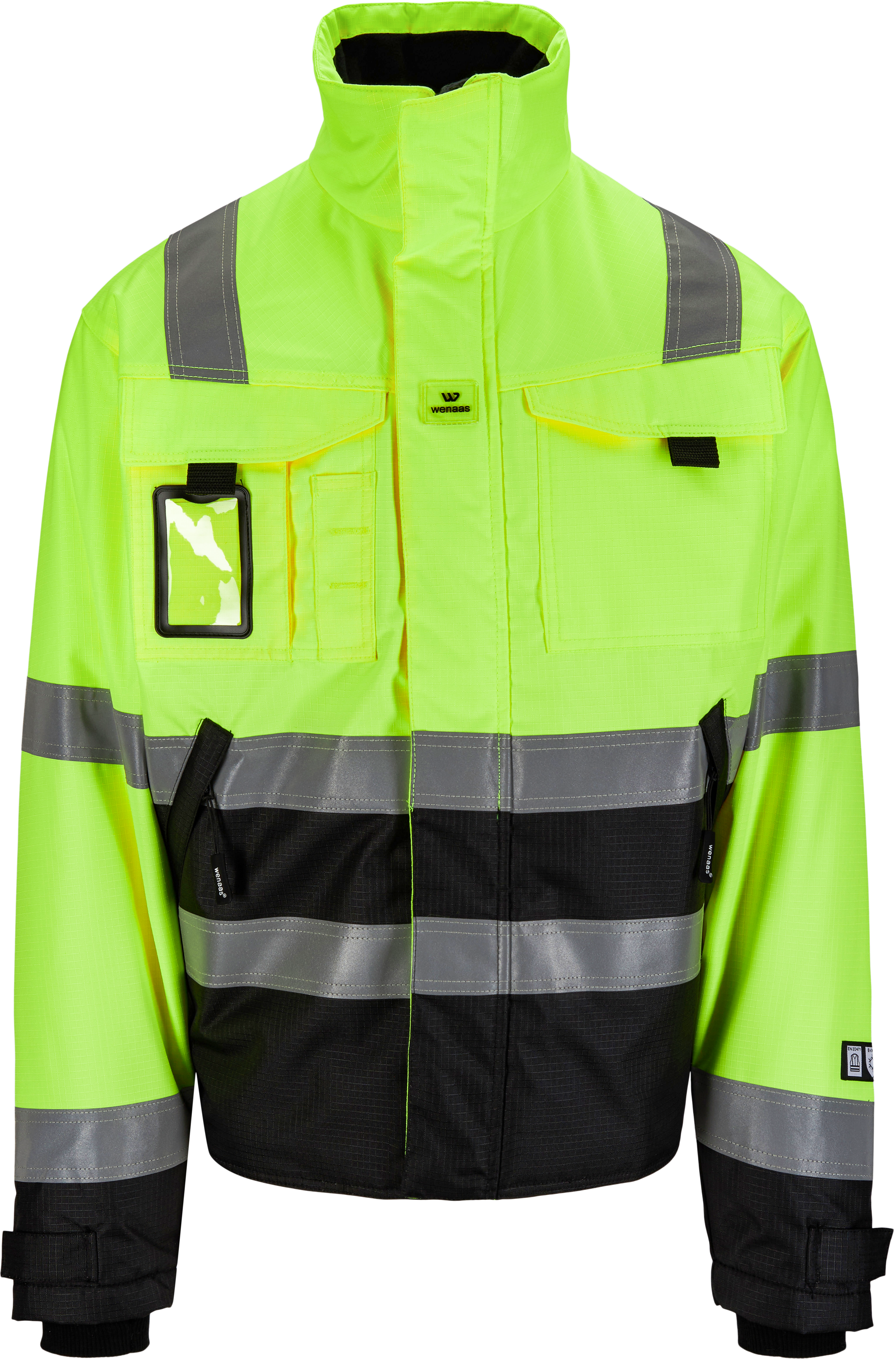 Doorgestikt pilotenjack met goede zichtbaarheid van waterdichte stof met zachte fleece in de kraag. Ritssluiting, zak voor ID-kaart en extra, praktische zakken op de voorkant. Manchetten van gebreide ribstof met duimgat en verstelbare klittenbandstroken bij de manchetten en de achterkant van de taille. Dit jack is het best geschikt voor gebruik in de winter, maar kan ook worden gedragen bij de overgang tussen de seizoenen.