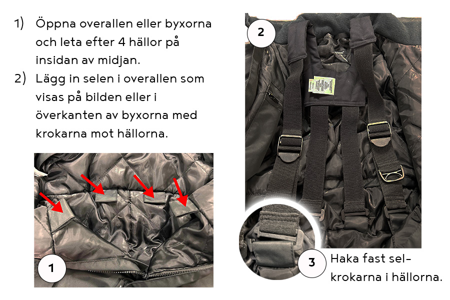 Wenaas har egna selar som du kan använda inuti både vinter- och sommaroverallen. Dessa fästs i några hällor som du hittar i din Wenaas-overall. När du har fäst selarna inuti overallen och justerat dem till rätt längd i förhållande till din kropp och storleken på overallen, kommer du märkbart känna att overallen sitter bättre. Selen avlastar och fördelar vikten på overallen på ett helt annat sätt. Resultatet är att overallen känns betydligt mer bekväm att ha på sig, vilket ger ökad komfort.