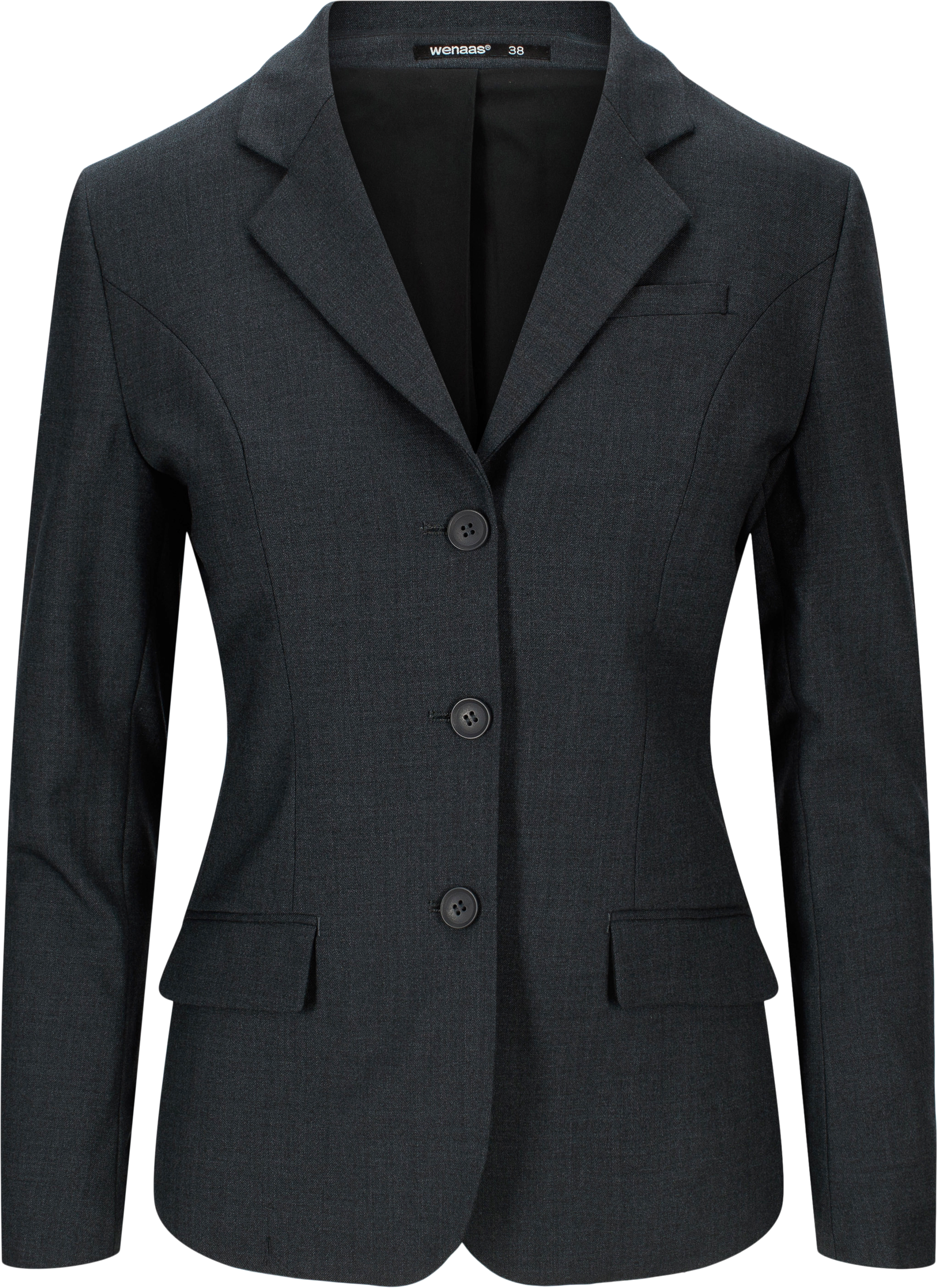 Formsydd, slim, enkelknäppt, med krage och slag, tre framfickor; två dubbelt infällda fickor med ficklock, en bröstficka, tvåsöms ärmar med stängt sprund, tre dekorativa knappar på ärmen, prinsessömmar fram och bak, stängs med tre knappar mitt fram, två innerfickor, inuti elastiskt foder. Slitstark tygkvalitet, smutsavvisande och andningsbar.